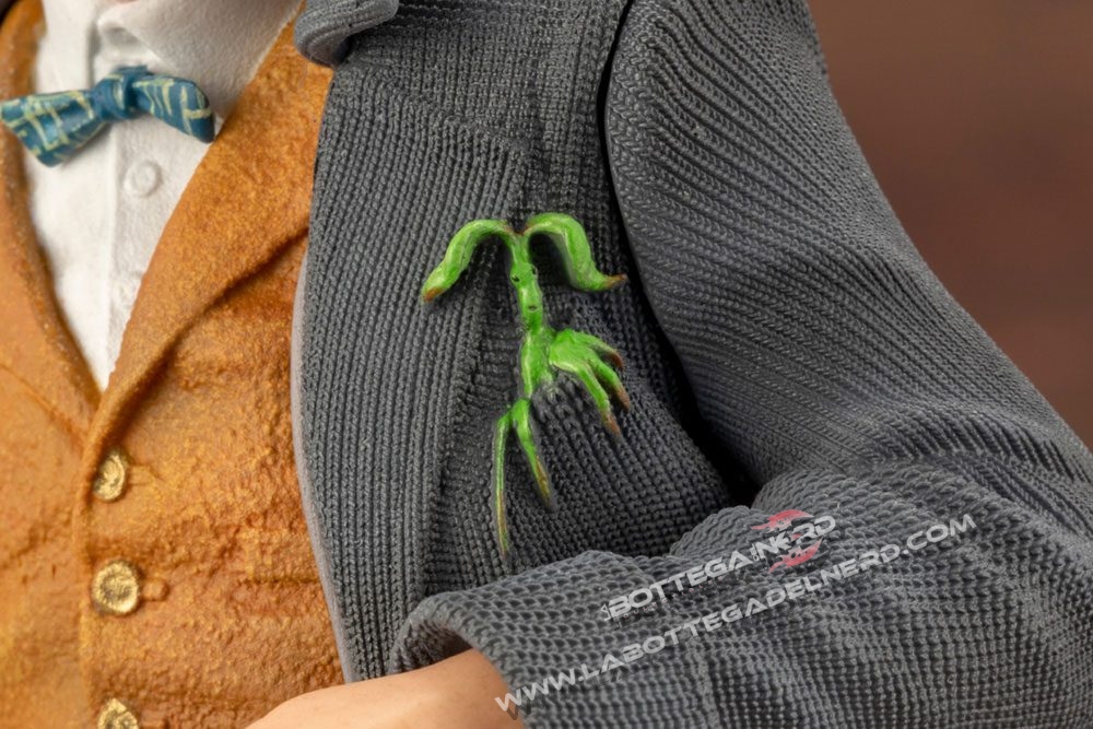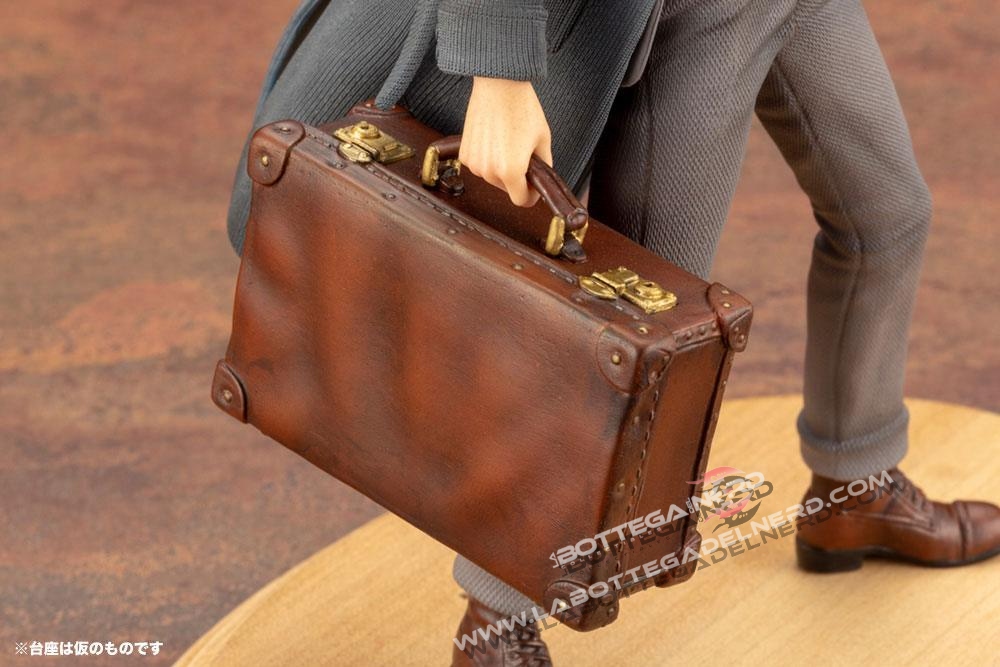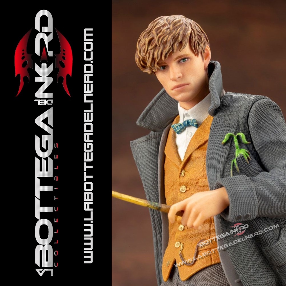 Il giovane mago è realizzato come appare nella saga cinematografica, con un lungo cappotto e la sua inseparabile valigetta in pelle, stretta in mano non poteva mancare ovviamente la sua bacchetta. Realizzata in scala 1/10, la figure raggiunge un’altezza di 18 cm.