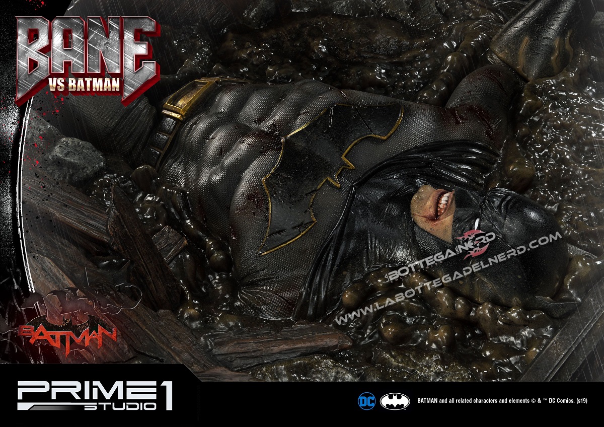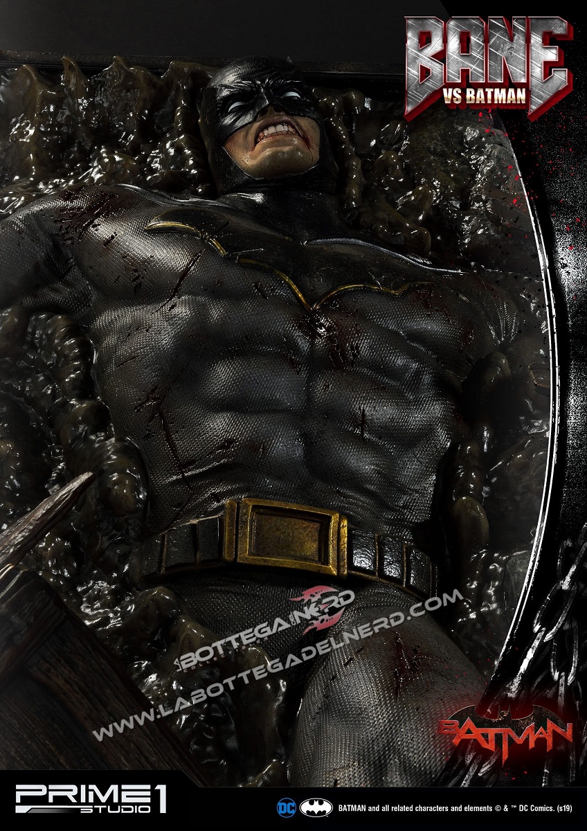La dinamica battaglia tra Bane e Batman è considerata una delle più iconiche. Due uomini forti che combattono sotto la pioggia. La scena drammatica mostra il veleno di Bane che si diffonde in tutto il corpo di Batman. Il massiccio antagonista dell’uomo pipistrello è realizzato in scala 1/3 con un’altezza di 83 cm ed assume una posa minacciosa, resa ancora più drammatica dal corpo agonizzante di BATMAN posto ai piedi di BANE.