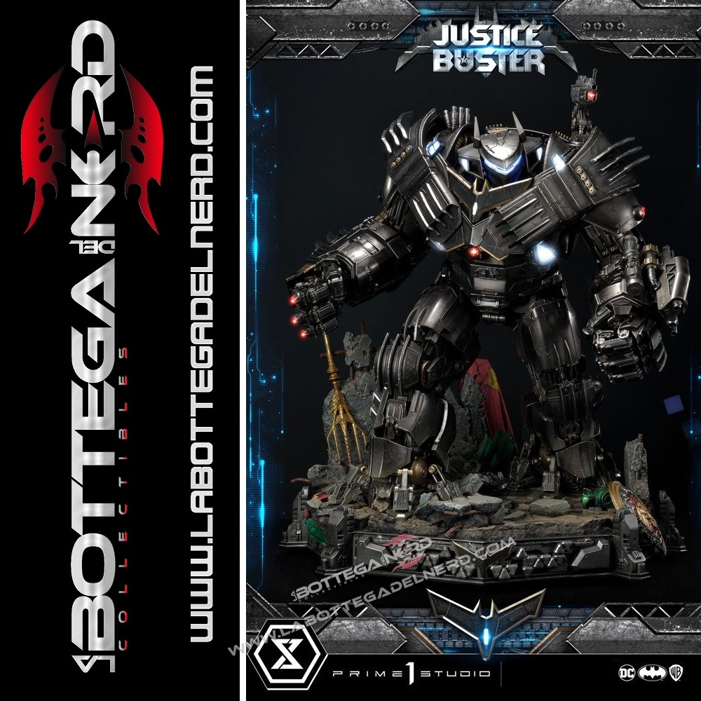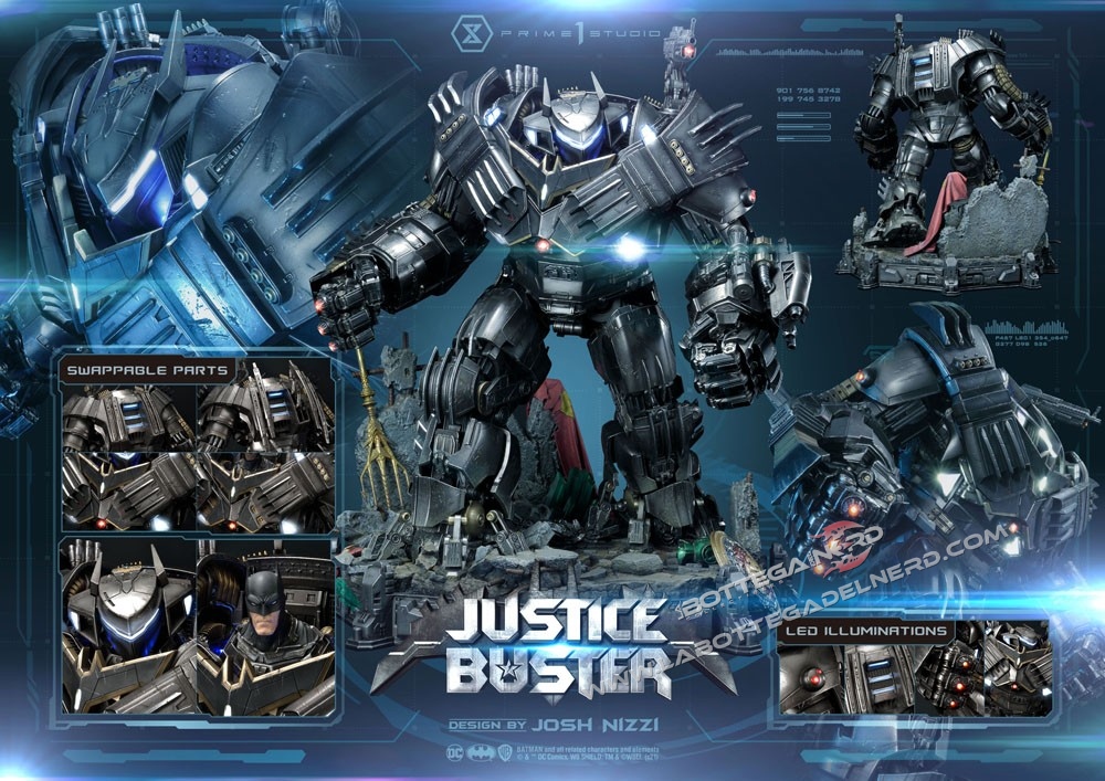 La statua di Justice Buster è stata ispirata dalla trama storica; e il grande artista Josh Nizzi ne migliora ogni minimo dettaglio. La pittura è super realistica, nell’armatura del possente Justice Buster si vedono gli effetti degli agenti atmosferici come ad esempio l’acqua, l’illuminazione a LED posizionata strategicamente e una posa imponente lo distinguono da qualsiasi altra statua! l’elmo del Justice Buster si può togliere per essere sostituito con testa di Batman. CAPOLAVORO!
