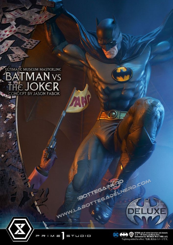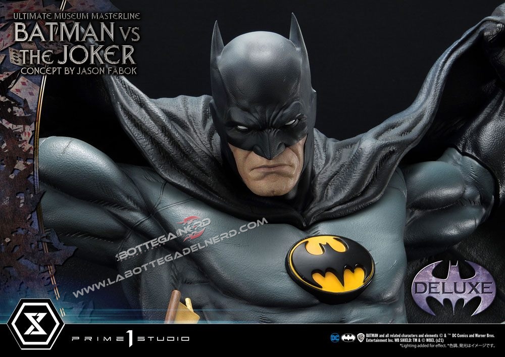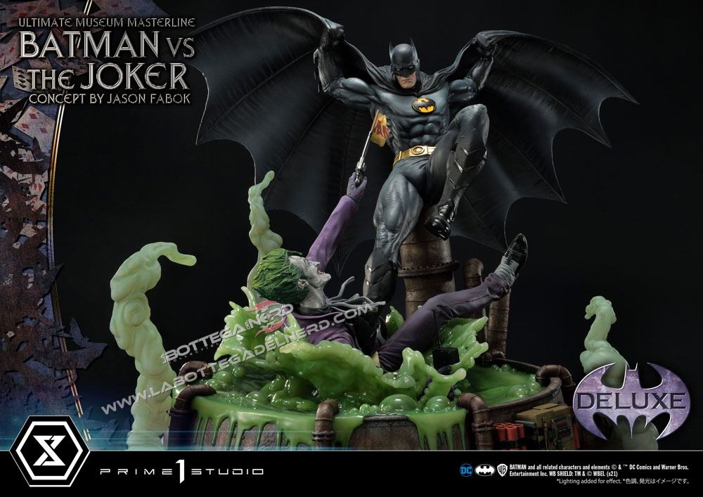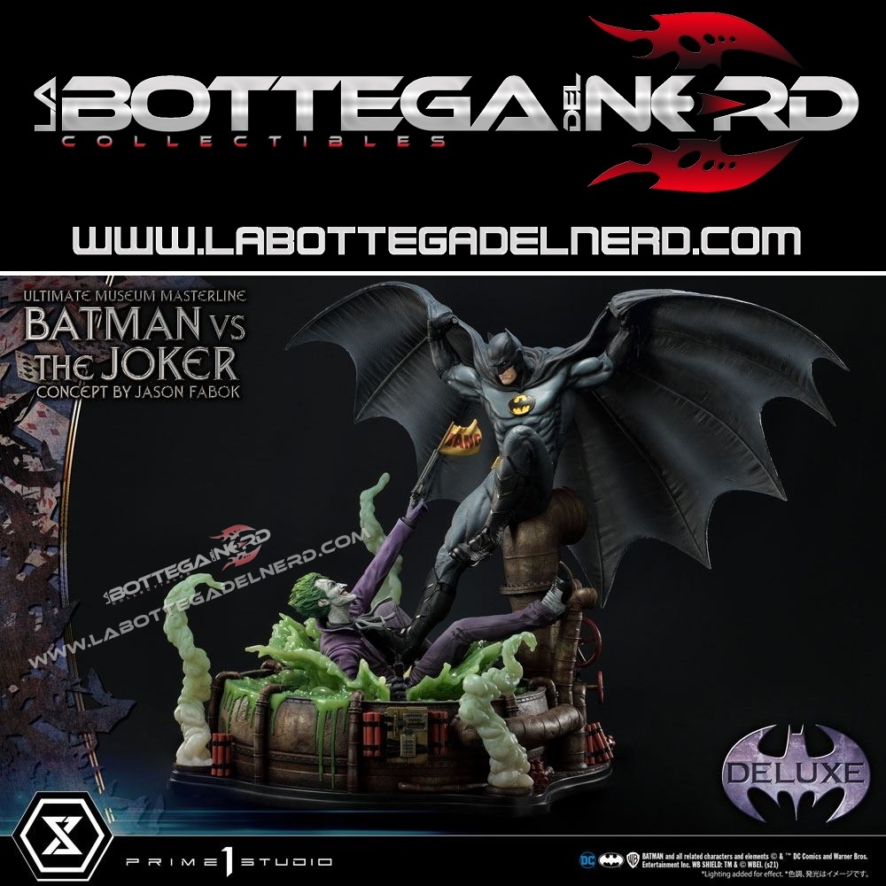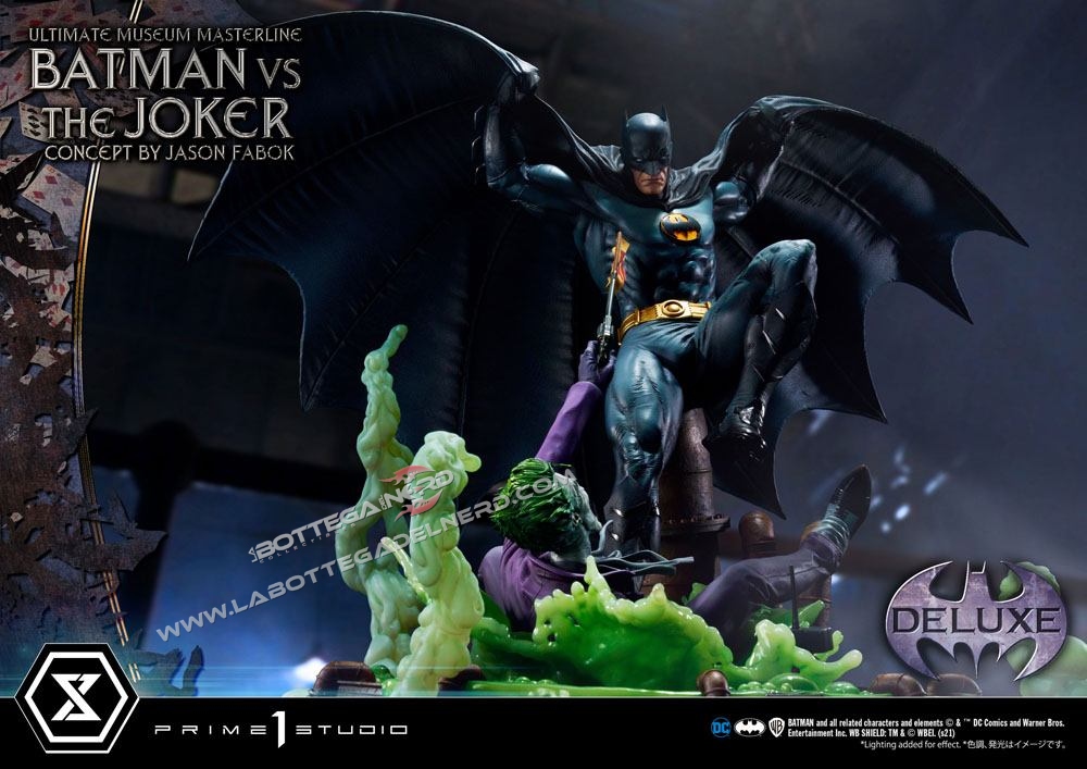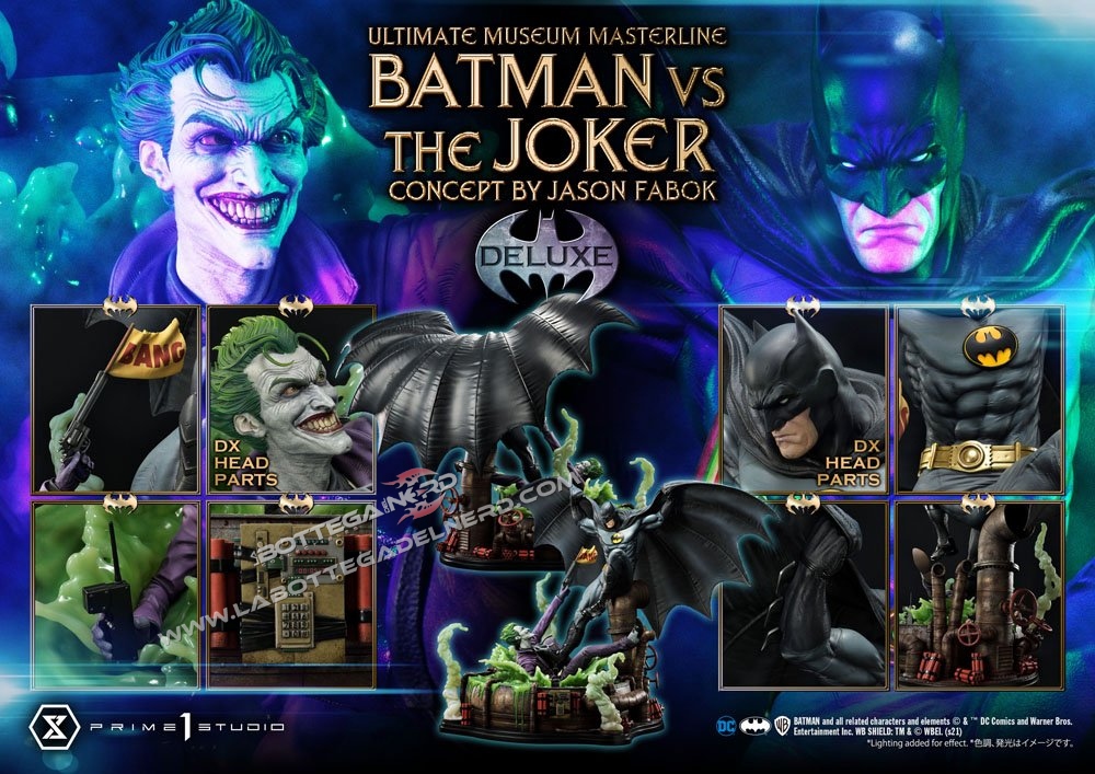 Su un concept di Jason Fabok, la statua Batman versus The Joker Ultimate Museum Masterline raffigura il Cavaliere Oscuro mentre sferra un calcio al Joker, gettandolo in una pozza di liquame tossico. Il momento è immortalato in modo spettacolare, data anche la generosa scala 1/3 che permette alla scultura di raggiungere gli 85 cm d’altezza e più di un metro di larghezza.