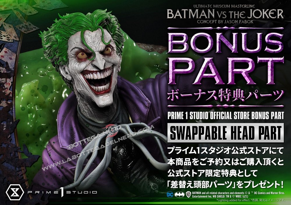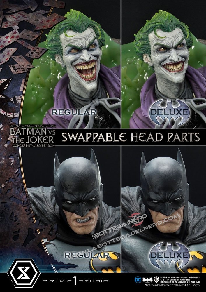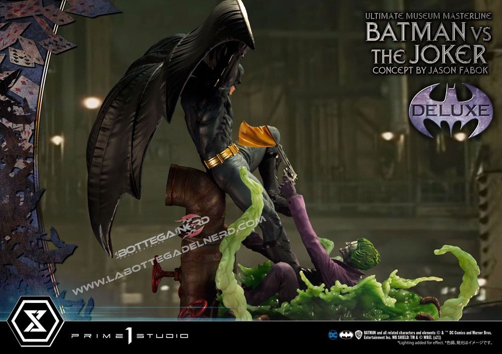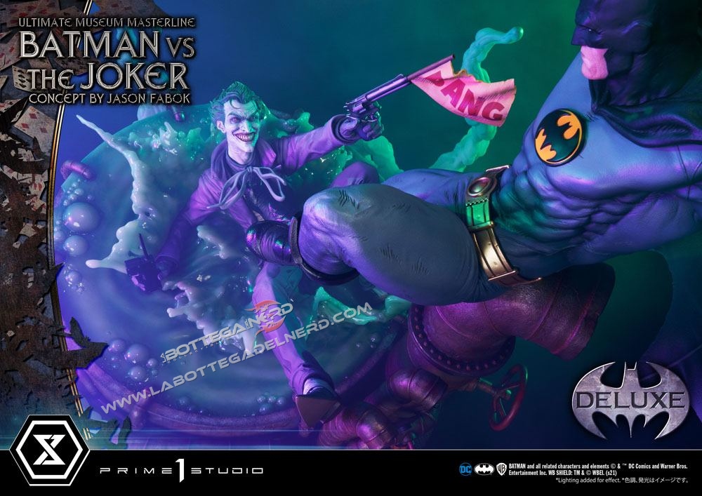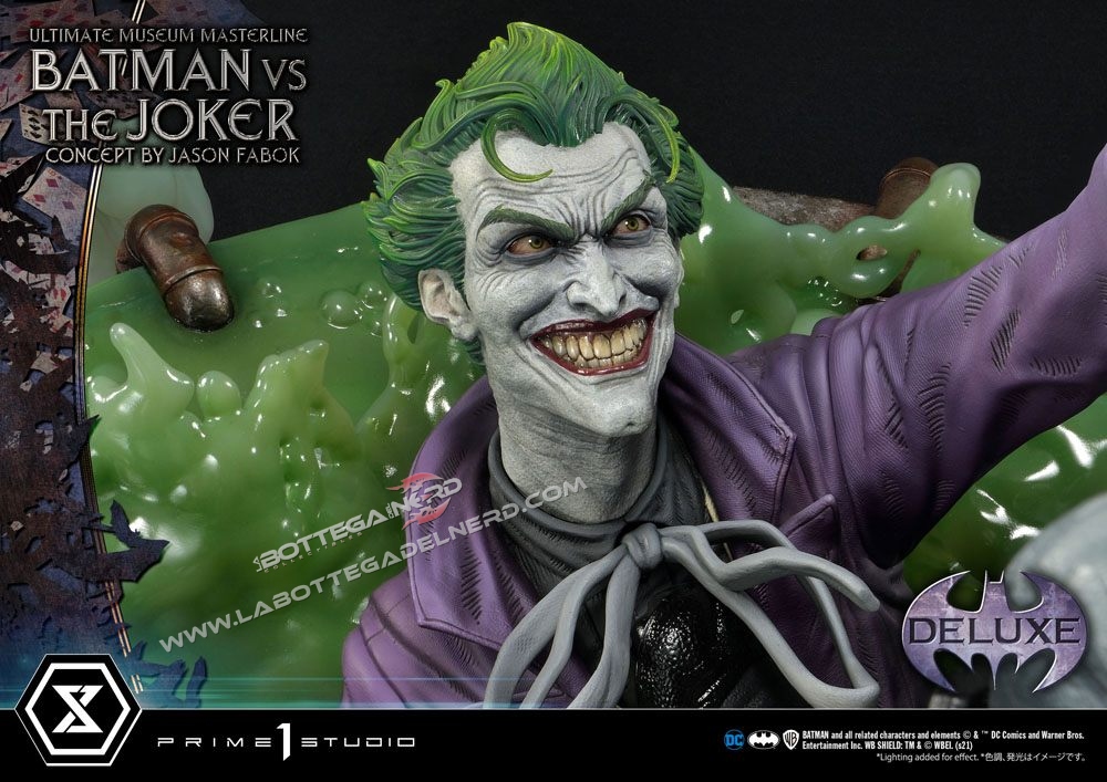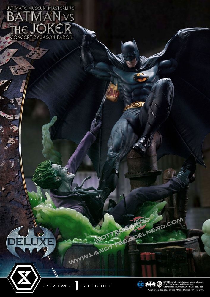 Su un concept di Jason Fabok, la statua Batman versus The Joker Ultimate Museum Masterline raffigura il Cavaliere Oscuro mentre sferra un calcio al Joker, gettandolo in una pozza di liquame tossico. Il momento è immortalato in modo spettacolare, data anche la generosa scala 1/3 che permette alla scultura di raggiungere gli 85 cm d’altezza e più di un metro di larghezza.
