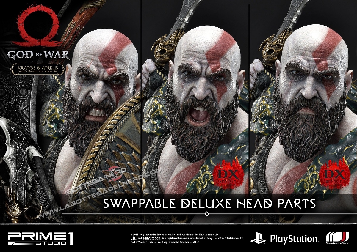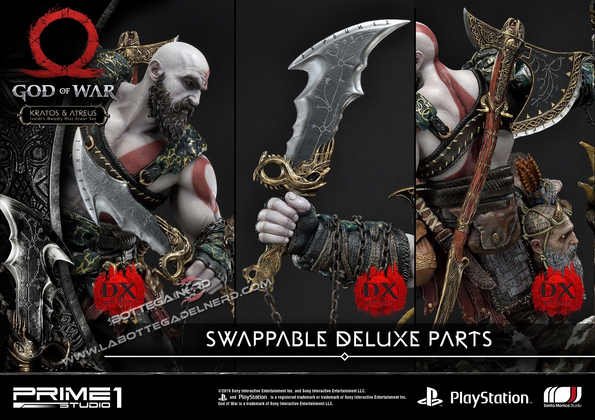 QUESTA VERSIONE DELUXE COMPRENDE DUE TESTE INTERCAMBIABILI DI KRATOS E LE LAME DEL CAOS DA SOSTITUIRE ALL’ASCIA (LEVIATANO) E LO SCUDO!