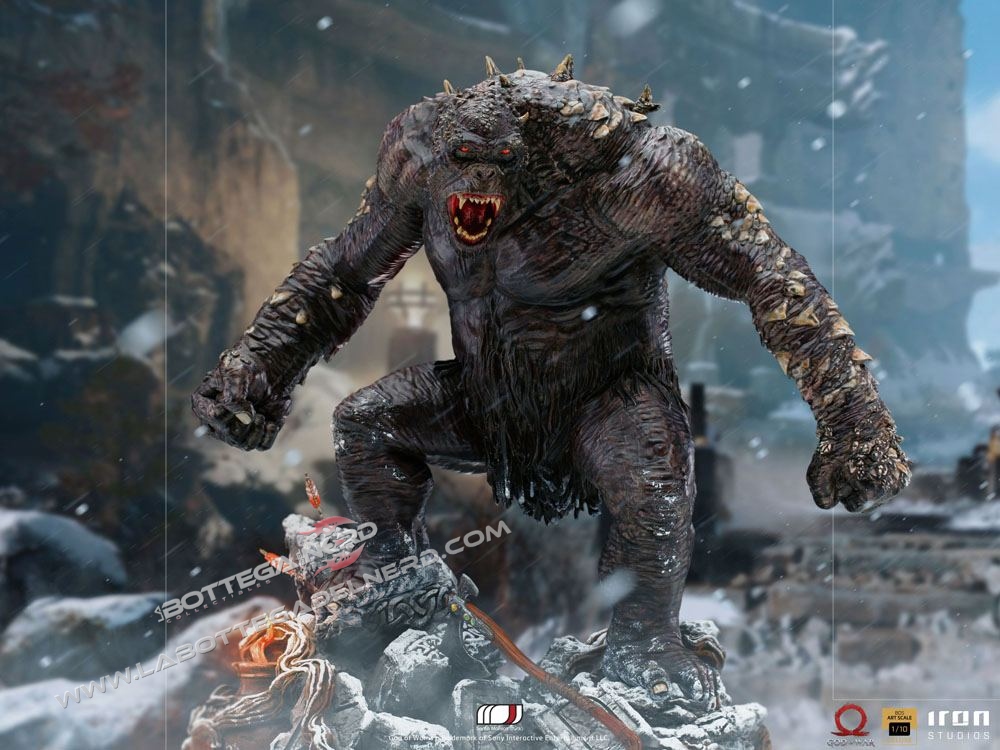 Iron Studios presenta la statua dedicata all’ Orco mentre si arrampica su una base piena di rottami di una rovina nordica con riferimenti al gioco.