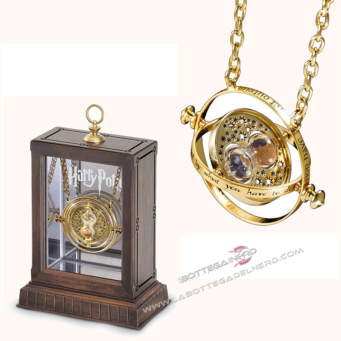 Noble Collection presenta il giratempo di Hermione. Prodotto ben fatto, e’ l’esatta riproduzione di quello visto nel film; la sabbia della clessidra si sposta da un’ampolla all’altra ed il meccanismo e’ perfettamente funzionante. Può essere esposto nella teca (inclusa nella confezione) realizzata in pregiato legno con fondo specchiato ed il marchio di Harry Potter.