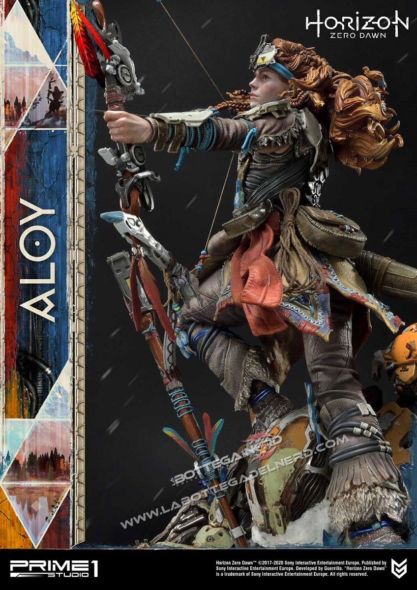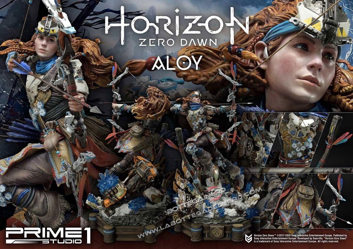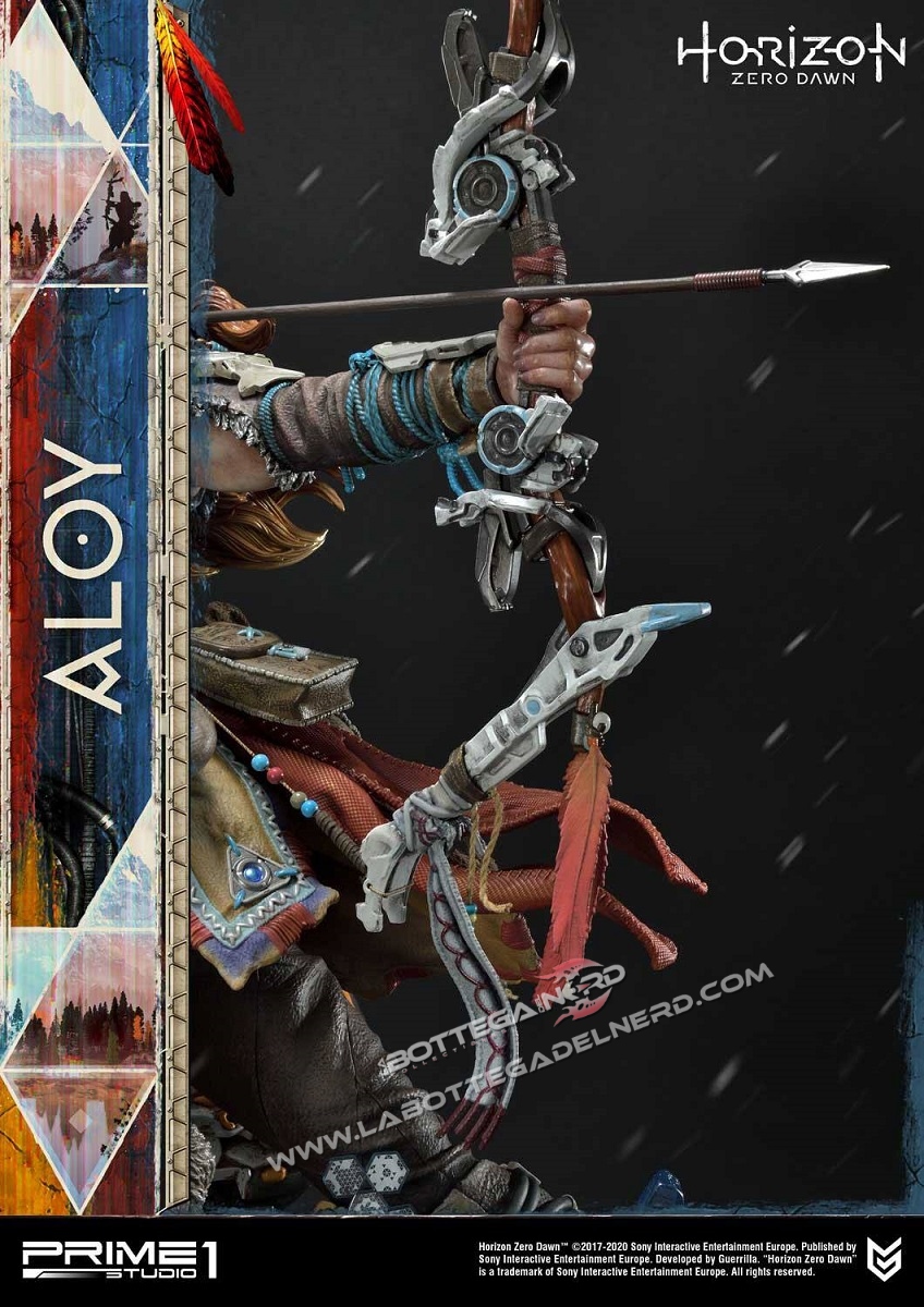 Aloy è raffigurata con lo Shield-Weaver Armor Set ed è scolpita in un’elegante posa mentre salta tendendo il suo arco, pronta a scagliare una freccia verso una delle feroci macchine che infestano il mondo di gioco. La statua è disponibile con due differenti archi. La statua misura un’altezza pari a 70 cm ed è perfetta da esporre in coppia con lo Stalker, venduto separatamente.