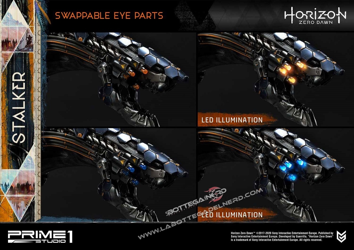 La statua è a cura di Prime 1 Studio per la linea Ultimate Premium Masterline in scala 1/4, con un’altezza di 68 cm la bestia è raffigurata su di una roccia mentre si prepara a colpire, risultando perfetta in esposizione in coppia con Aloy. La testa potrà illuminarsi sia con led arancio che blu, come mostrato nelle foto ufficiali e nel video disponibile poco sopra.