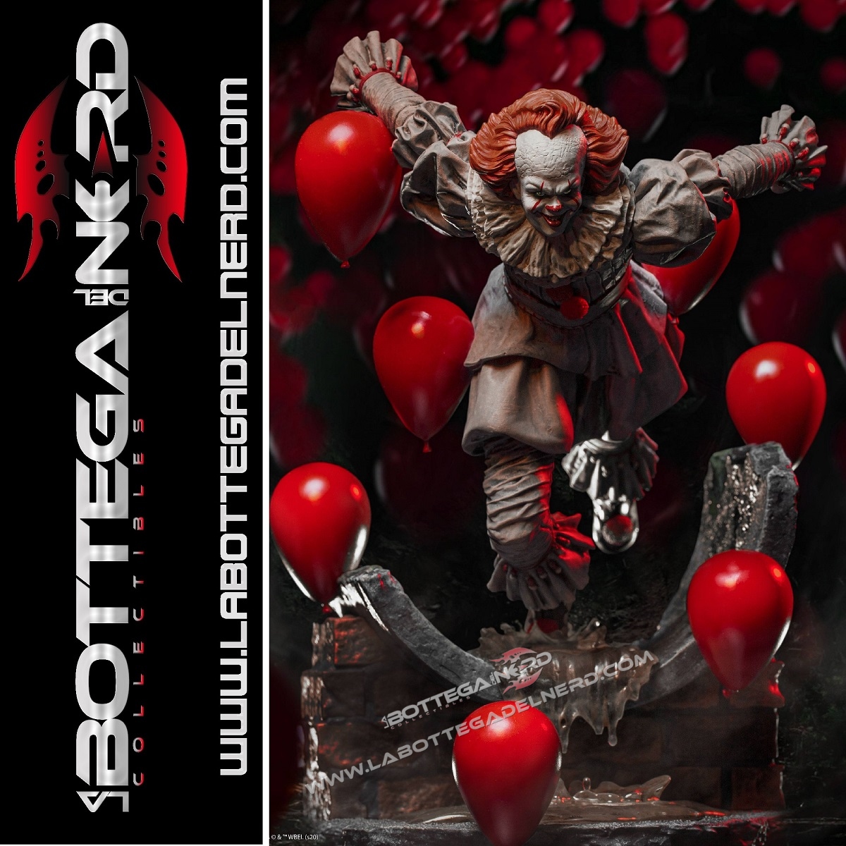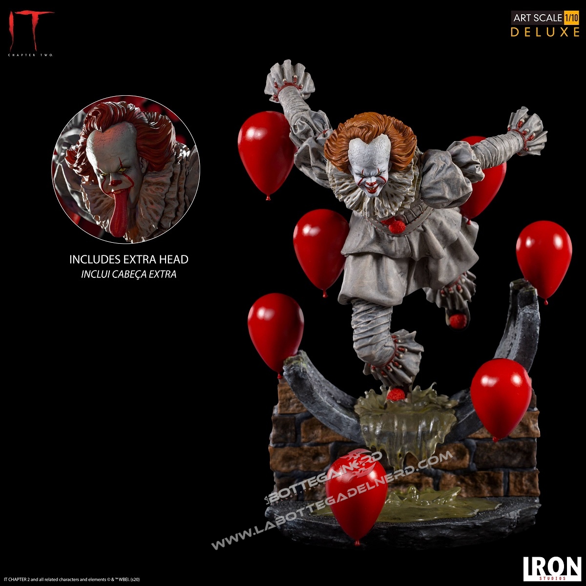 La statua raffigura il Clown mentre corre fuori dalle fogne di Derry, la cittadina del Maine in cui si svolgono le vicende narrate nel romanzo di Stephen King “IT“, recentemente riadattato in due film. La scultura è brillantemente circondata da palloncini rossi, che donano spettacolarità e aggiungono inquietudine alla scena. Sarà anche disponibile una testa alternativa, qualora il sorriso di Pennywise non fosse abbastanza terrificante.