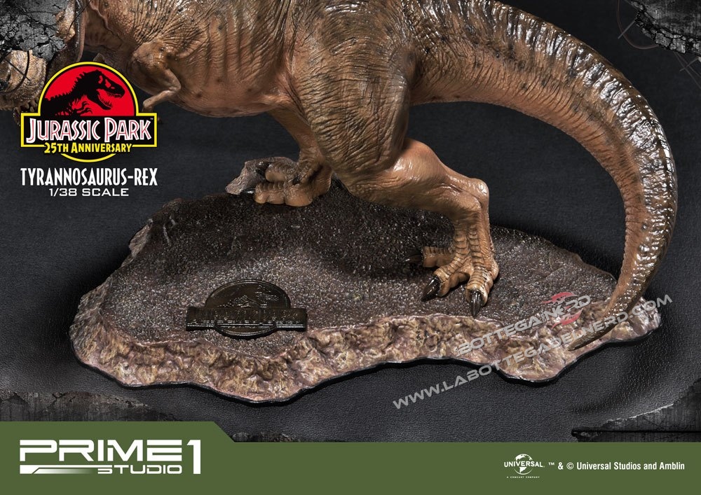 Gli artigiani di Prime 1 Studio hanno scolpito le intricate scaglie, denti e punte del Tyrannosaurus-Rex con la massima maestria. Non hanno risparmiato sforzi nel ricreare l’anatomia muscolare del Tyrannosaurus-Rex. Ogni ruga, protuberanza perfino la sua cicatrice distintiva sono scolpite e posizionate meticolosamente. La pittura risulta essere molto accurata, a partire dai freddi occhi gialli, fino ad arrivare agli umidi e affilati denti. Questo T-Rex ritrae perfettamente la sua colorazione naturale così come apparsa nel film. La statua del Tyrannosaurus-Rex è in scala 1/38.