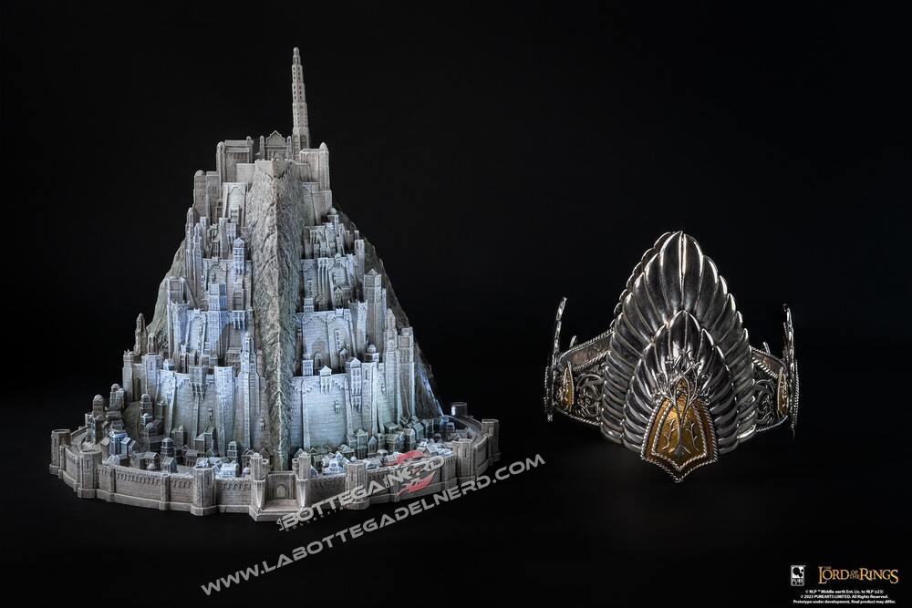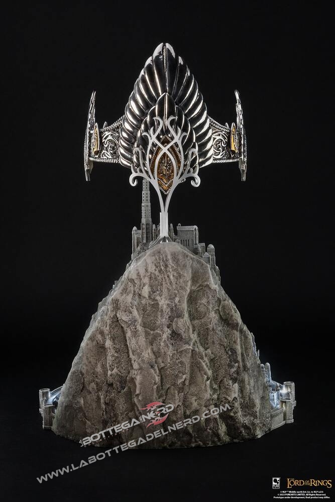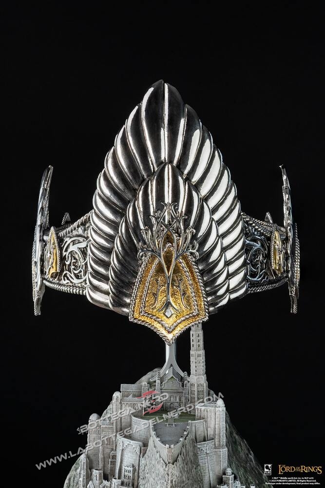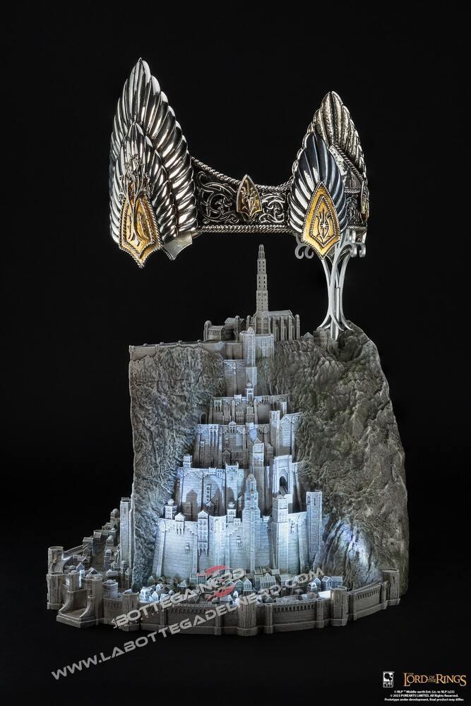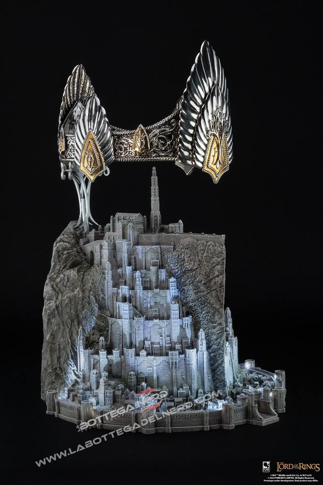 Questa scultura è un oggetto da collezione molto impressionante e imponente. Minas Tirith è ricreata minuziosamente la quale è illuminata con delle splendidi luci a LED, ogni particolare è scolpito con curata minuzia, la scultura della città di Gondor fa da base alla vera protagonista della scultura, ovvero la corona di Gondor in scala 1:1 indossata da Aragorn nell’ultimo film della trilogia di Peter Jackson.