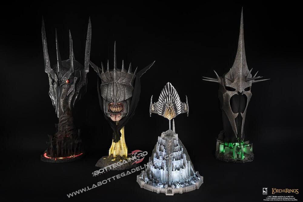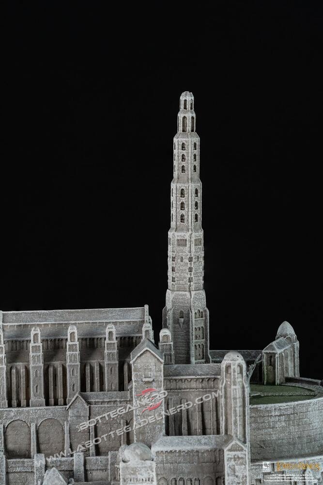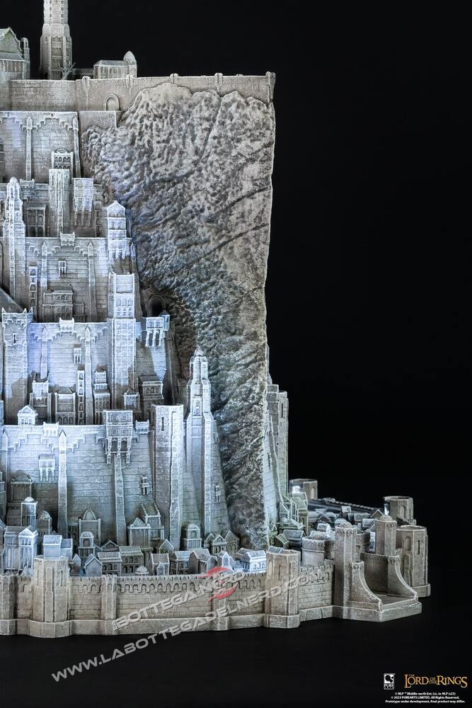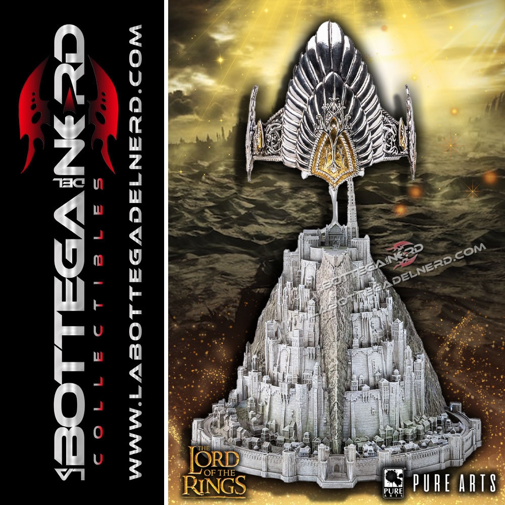Questa scultura è un oggetto da collezione molto impressionante e imponente. Minas Tirith è ricreata minuziosamente la quale è illuminata con delle splendidi luci a LED, ogni particolare è scolpito con curata minuzia, la scultura della città di Gondor fa da base alla vera protagonista della scultura, ovvero la corona di Gondor in scala 1:1 indossata da Aragorn nell’ultimo film della trilogia di Peter Jackson.