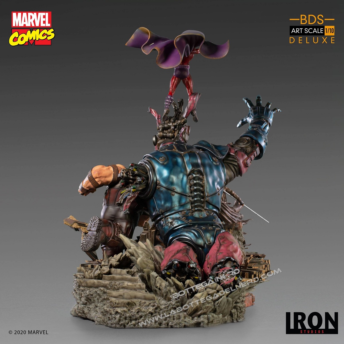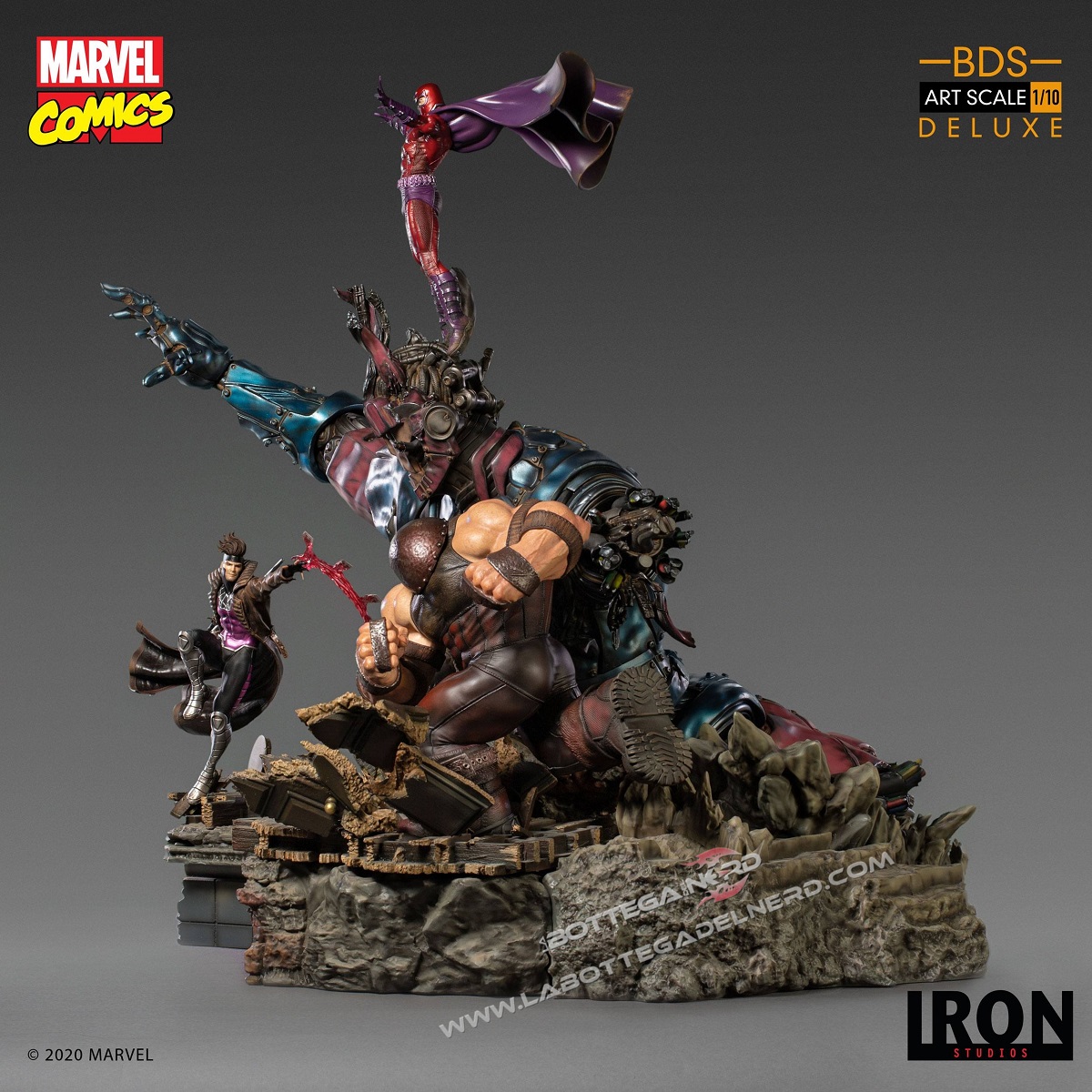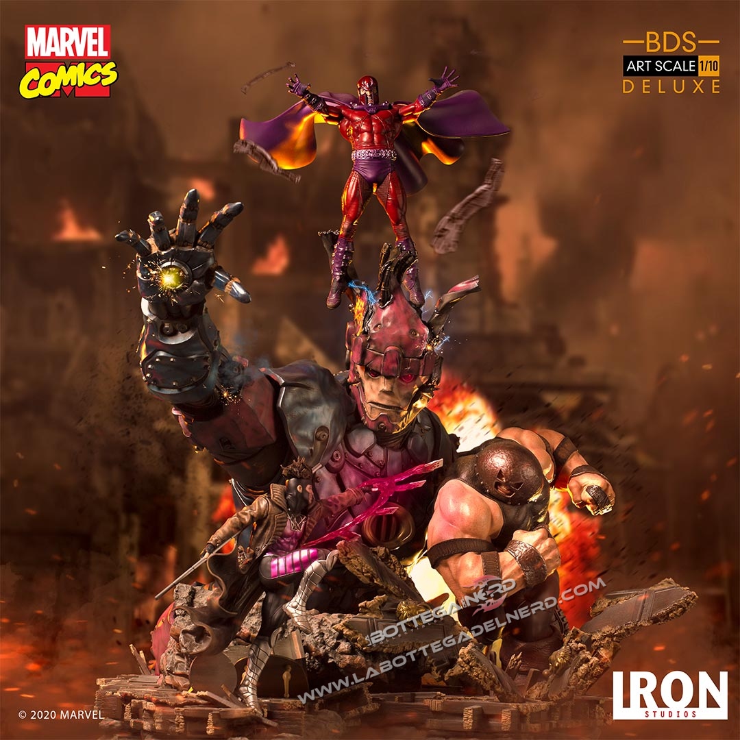 L’epica scena vede Gambit, Magneto e Juggernaut usare i loro poteri per fermare la terribile minaccia meccanica, che sviluppa un’altezza complessiva di ben 87 cm, nonostante la scala 1/10 di produzione. I singoli personaggi saranno disponibili anche singolarmente.