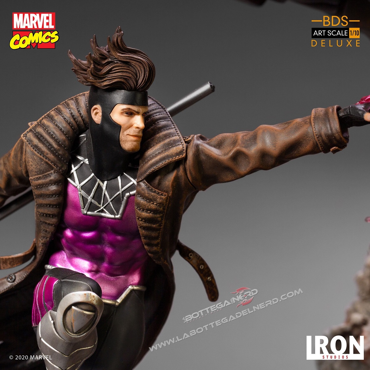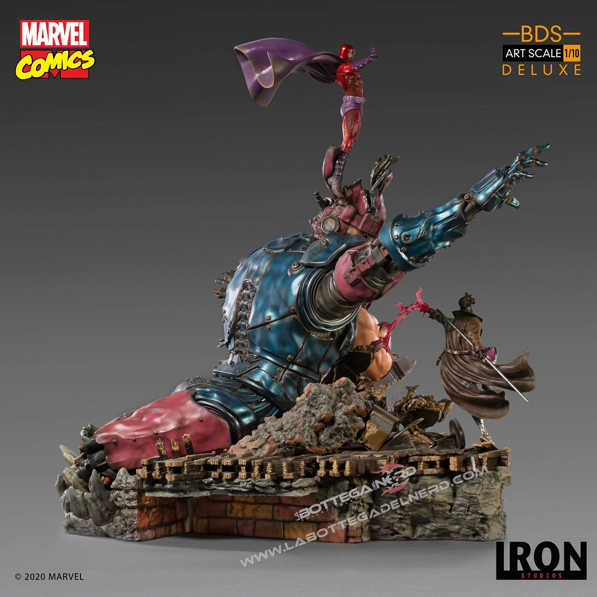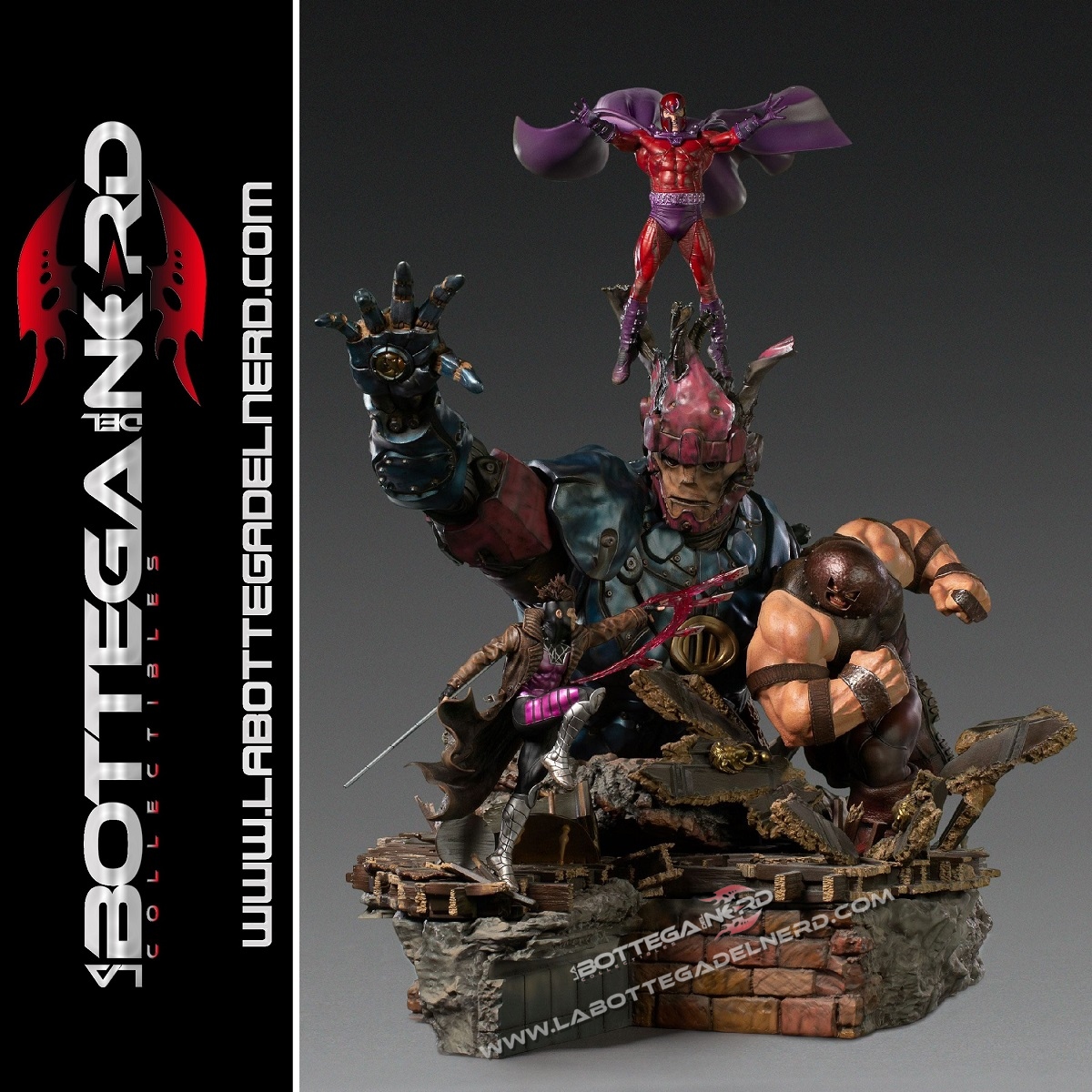 L’epica scena vede Gambit, Magneto e Juggernaut usare i loro poteri per fermare la terribile minaccia meccanica, che sviluppa un’altezza complessiva di ben 87 cm, nonostante la scala 1/10 di produzione. I singoli personaggi saranno disponibili anche singolarmente.