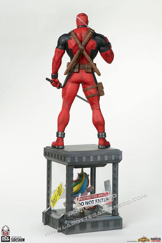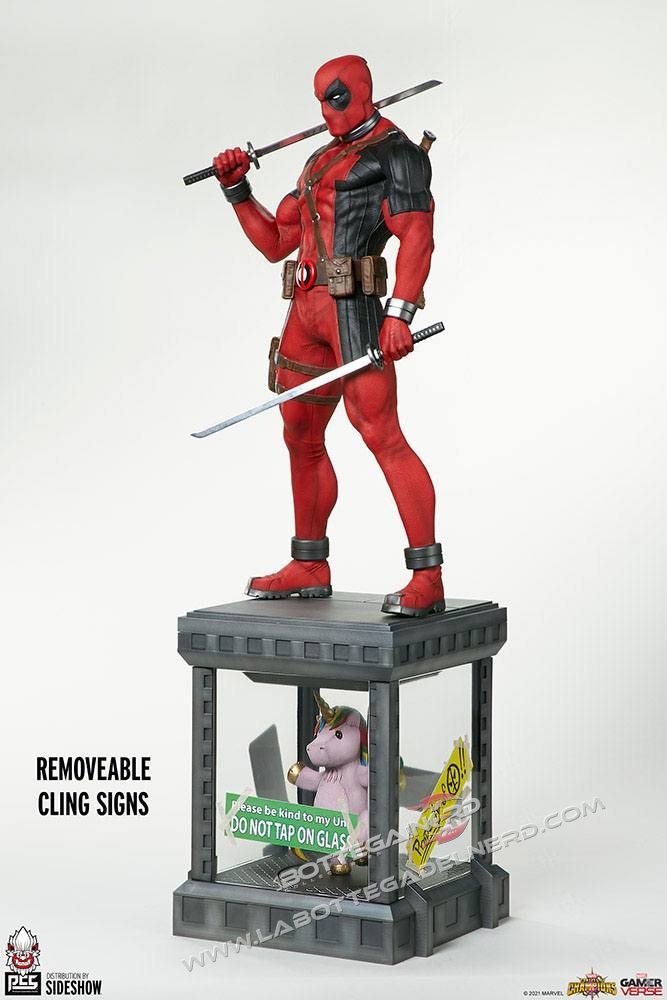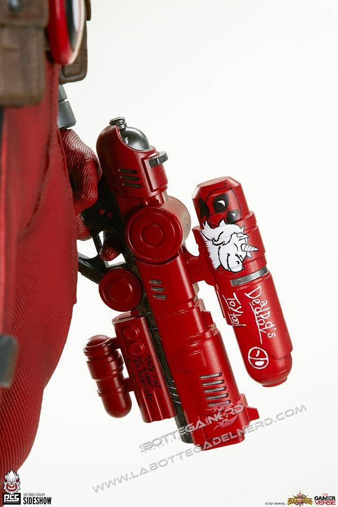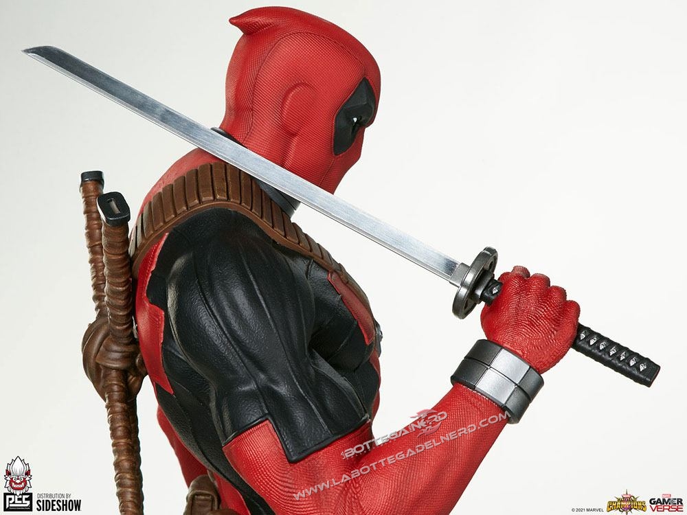 La statua come si vede in foto è completamente scolpita in resina e presenta dettagli molto curati grazie alle texture su tutto il corpo. Wade Wilson avrà il classico vestito rosso e nero e potrà alternare tra gli accessori due katane o due pistole oltre a due teste intercambiabili per esporlo nel modo più gradito.