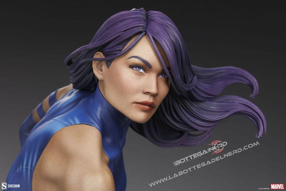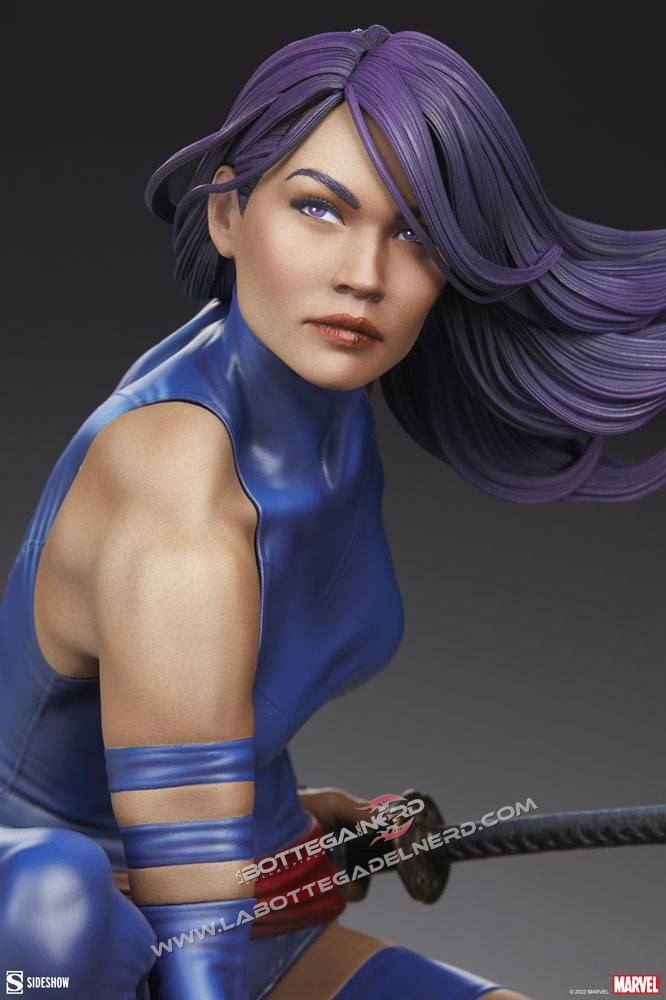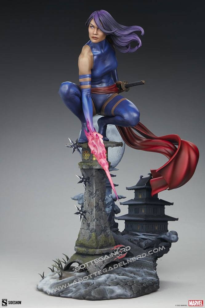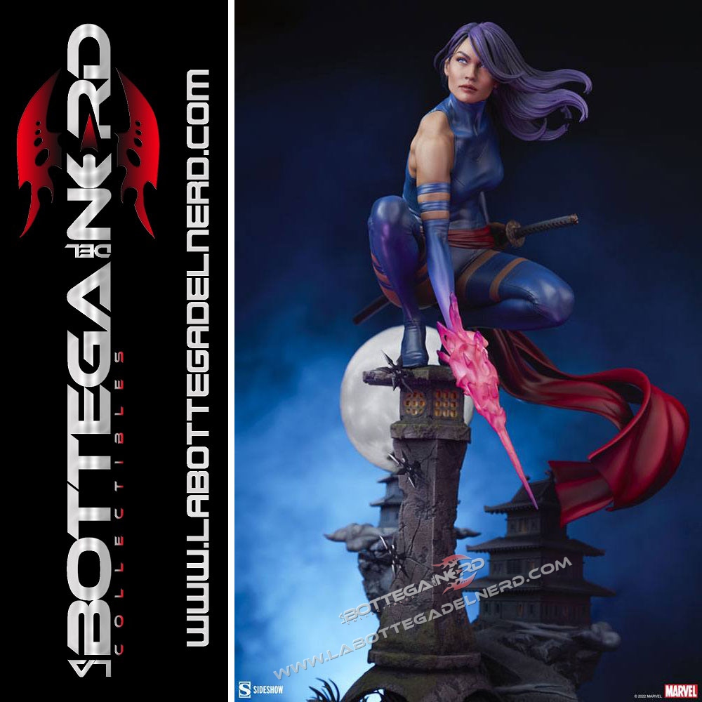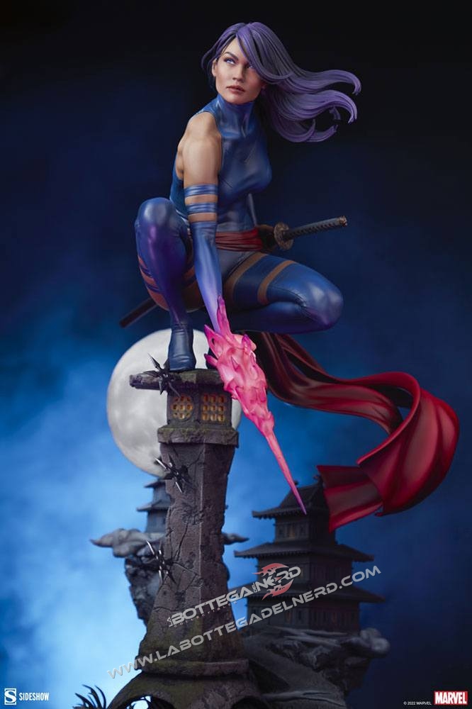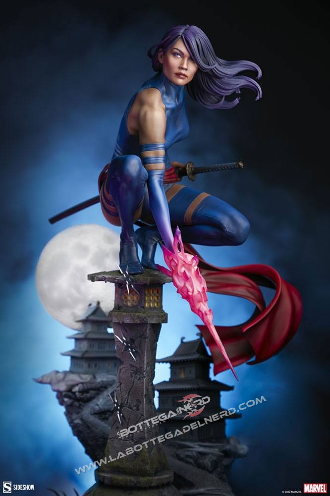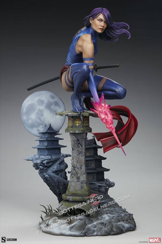 La mutante è realizzata su una basetta diorama, poggiata su una lanterna di pietra richiamando l’oriente, con la Luna sullo sfondo in prospettiva. Si potrà esporre Psylocke in due modalità, con la mano sulla katana pronta ad estrarla oppure mentre sfoggia i suoi poteri mutanti con una lama psionica. La statua avrà un’altezza complessiva di 53 cm in totale.