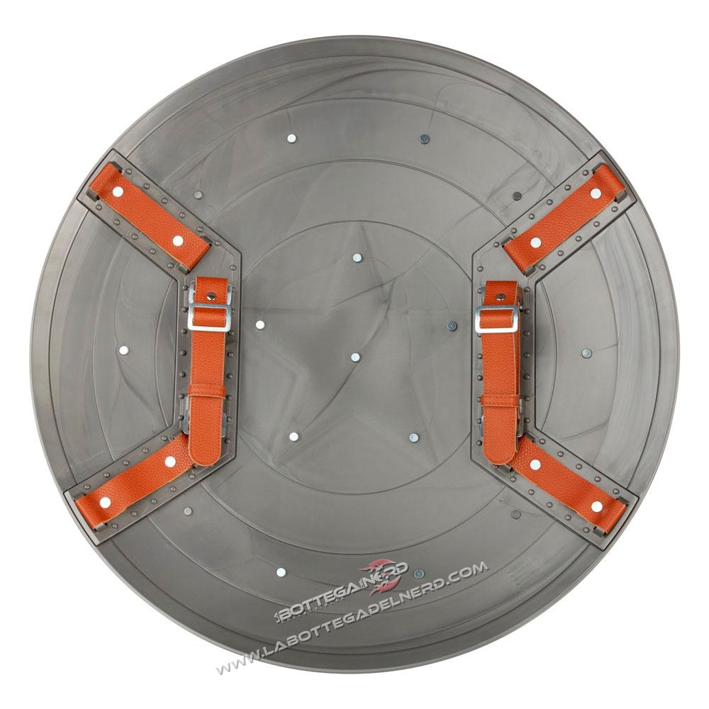 Lo scudo è realizzato in scala 1:1 e viene proposto con un diametro di 24″, (circa 60 cm). Progettato per replicare fedelmente il vero scudo utilizzato da Captain America, esso è dotato infatti di cinghie regolabili per poter essere indossato oltre che esposto dai collezionisti.