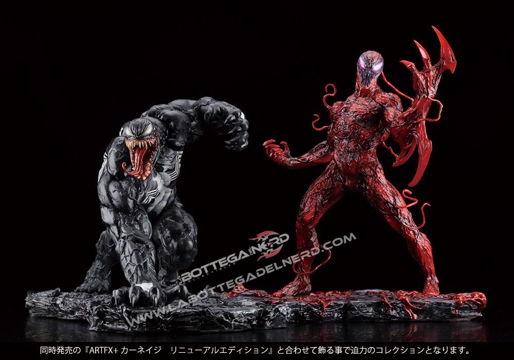 Originariamente prodotte nel 2017, le due ARTFX+ dedicate a Venom e Carnage sono proposte in Renewal Edition ma in cosa consistono queste nuove versioni? Pur mantenendo la stessa scultura di base, queste nuove edizioni presentano volti nettamente differenti e decisamente meno fumettistici rispetto le originali. Sono state modificate anche le basi, anche loro adesso di carattere più realistico. Venom ha un’altezza di 17 cm, mentre Carnage raggiunge i 20 cm.