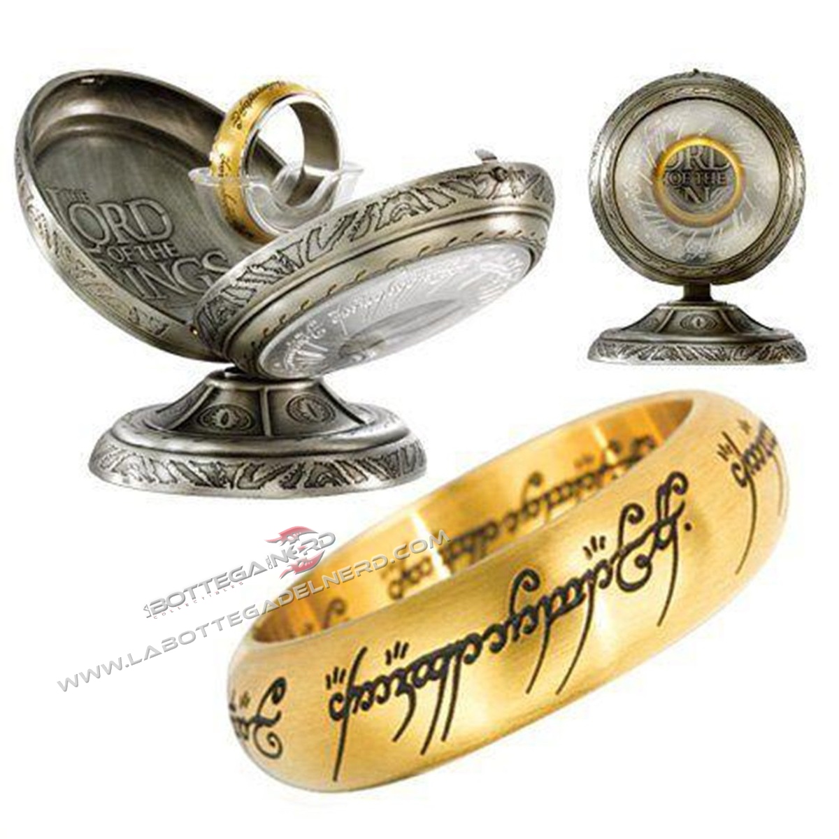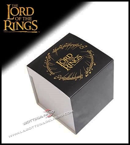 Edizione limited dell’Unico Anello, riprodotto in acciaio inox placcato in oro,e presentato in un espositore in metallo con apertura a conchiglia che ricorda l’occhio di Sauron e decorato con il logo del film. L’anello riporta le scritte con incisione al laser.