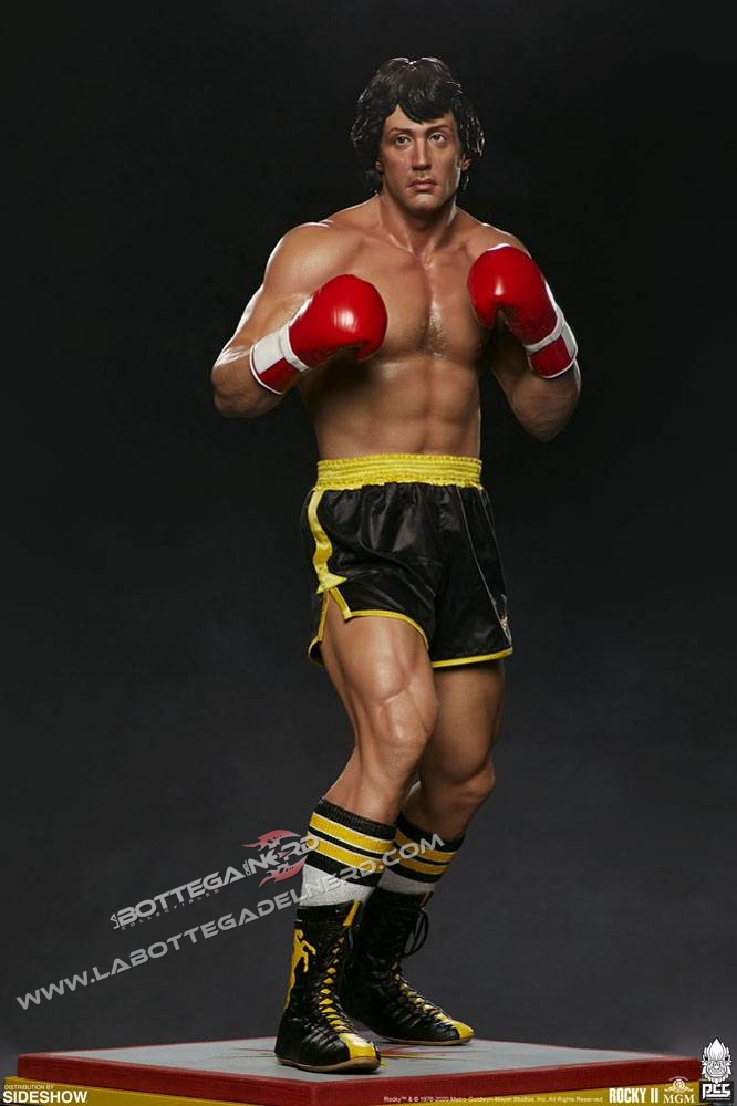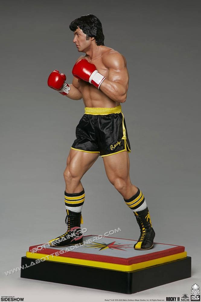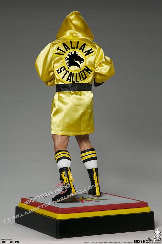 La statua è realizzata in due varianti, ispirate ai primi due capitoli della saga ed entrambe si rifanno ai due differenti match con lo storico amico/rivale Apollo Creed. La 1° variante è con i pantaloncini bianchi e rossi, mentre la seconda avrà quelli neri e gialli. Entrambe le varianti avranno come accessorio un accappatoio in vero tessuto, perfetto per realizzare il momento del pre-match. Trattandosi di una scala 1/3 l’altezza è decisamente generosa, con 66 cm totali.
