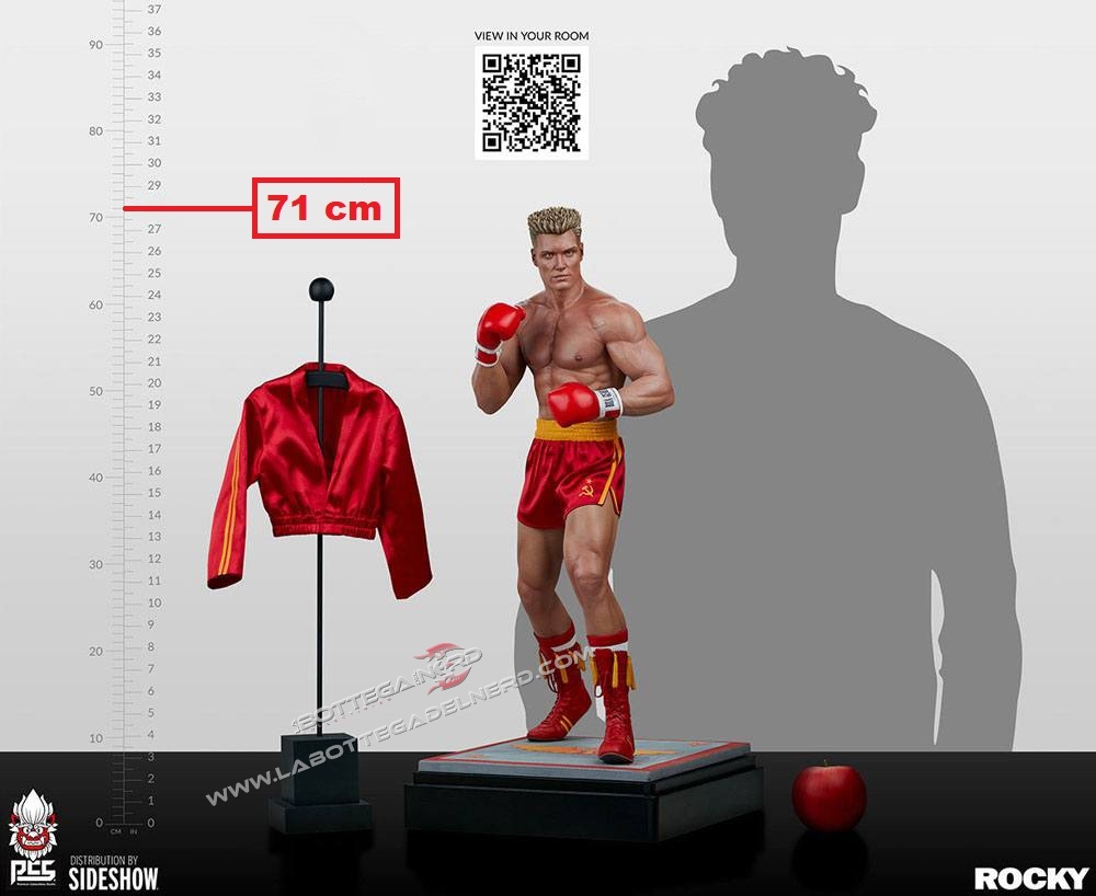 Scolpito in scala 1/3 per 71 cm d’altezza, Drago è raffigurato a pugni alzati, pronto a combattere. La statua è proposta in due edizioni, una con i pantaloncini rossi ed una con i pantaloncini dorati, ed entrambe hanno in corredo una giacca dello stesso colore dei pantaloncini. DA AVERE!