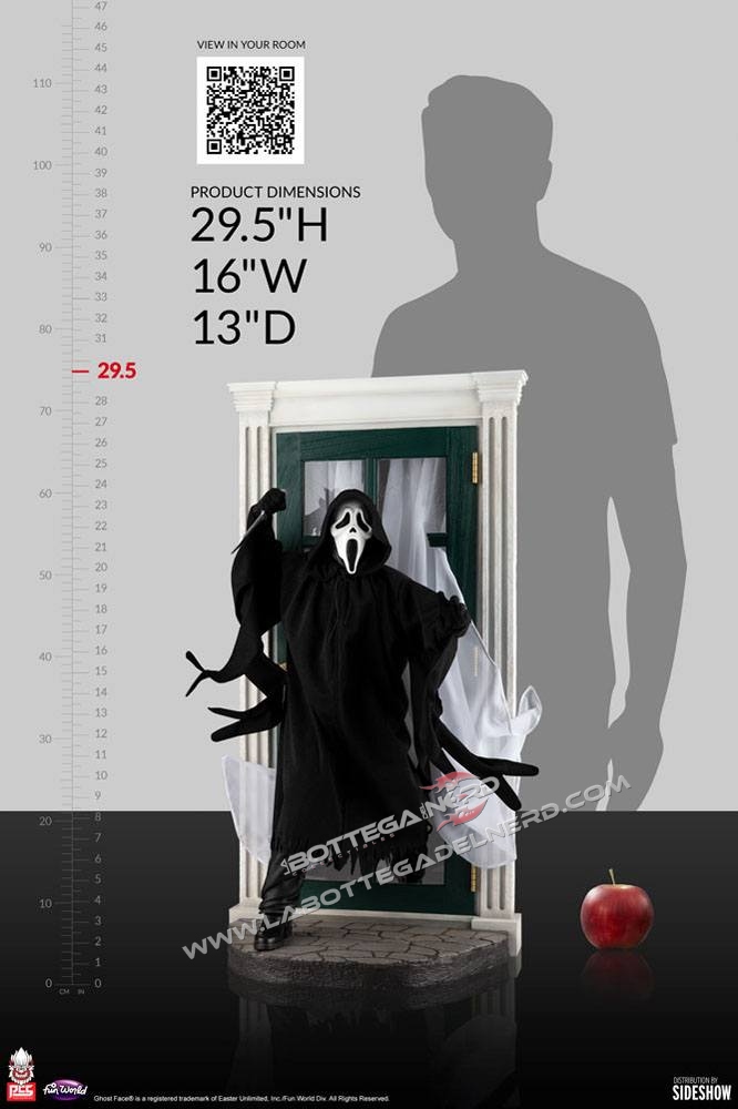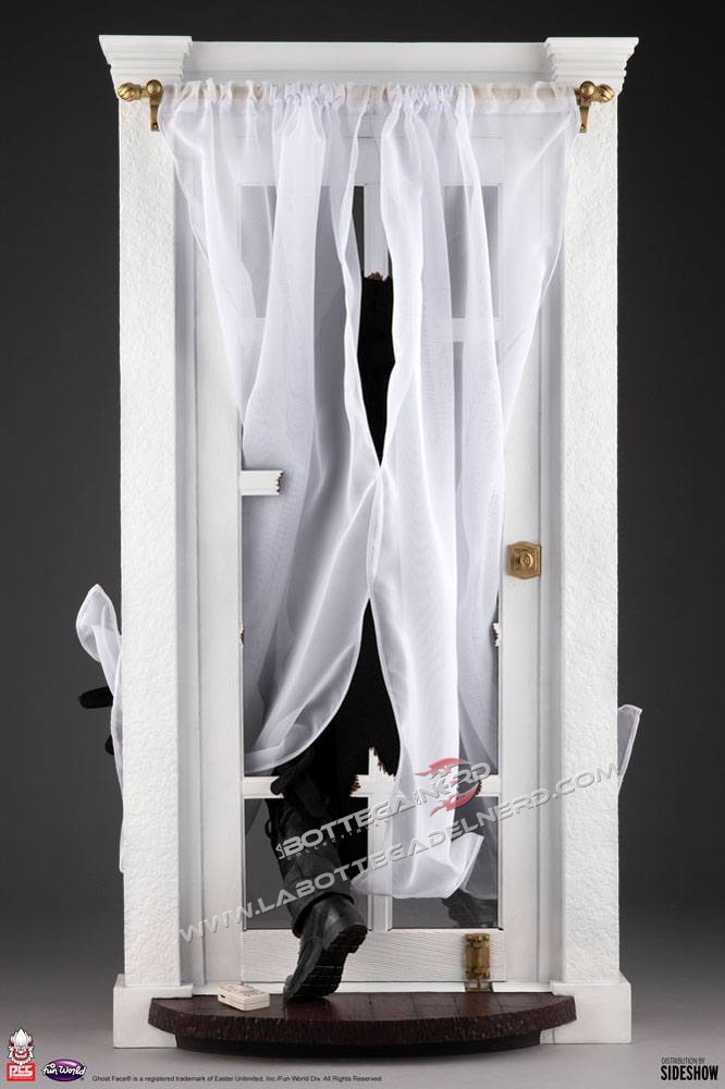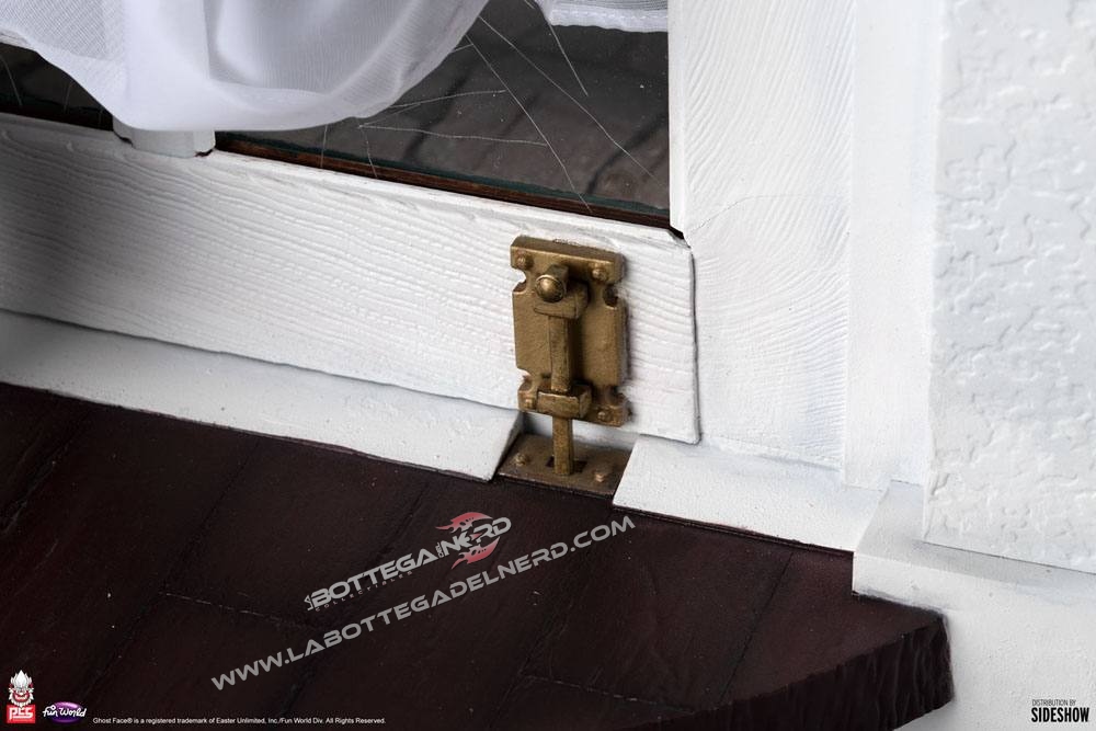 Prima di proseguire specifichiamo che non troverete la dicitura “Scream” nelle foto dato che per cavilli di licenza la ditta ha potuto rappresentare il caratteristico costume ma senza riferimenti espliciti al film. L’assassino è raffigurato mentre rompe una finestra irrompendo in una casa, coltello alla mano e pronto a colpire. La statua, realizzata in scala 1/3, misurerà nel complesso 75 cm d’altezza.