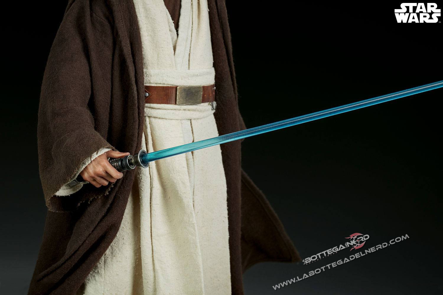 Diverse le soluzione d’esposizione, con la famosa lightsaber sguainata, oppure con l’elsa agganciata alla cintura con la mano pronta ad impugnarla.