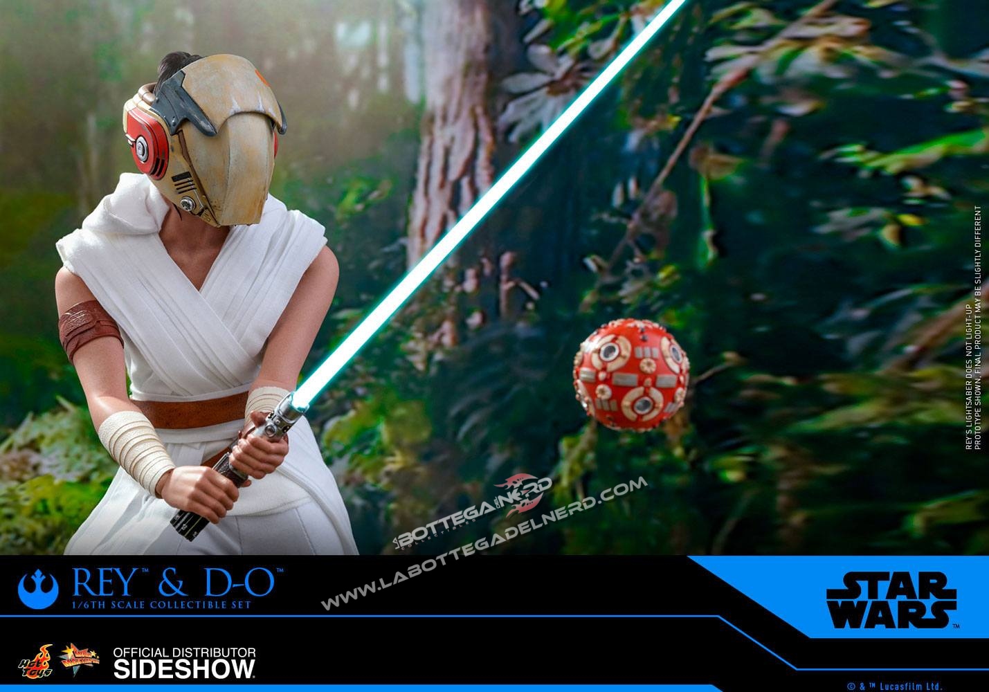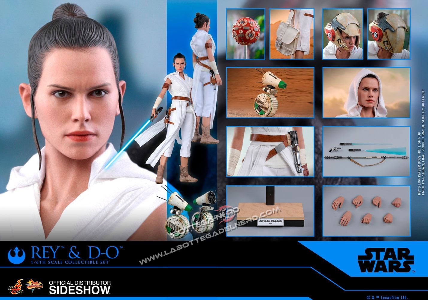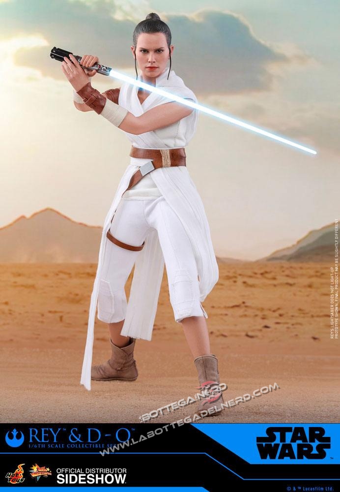 Rey è accompagnata dal suo nuovo droide D-O e la sua spada laser personale, dotata di funzione LED, la doll potrà essere esposta grazie alla sua base diorama, l’action figure viene fornita di molti accessori e sette diversi tipi di mani.
