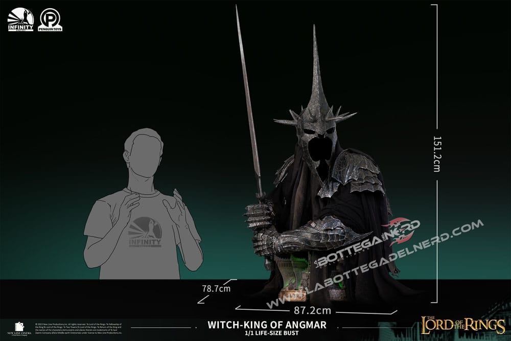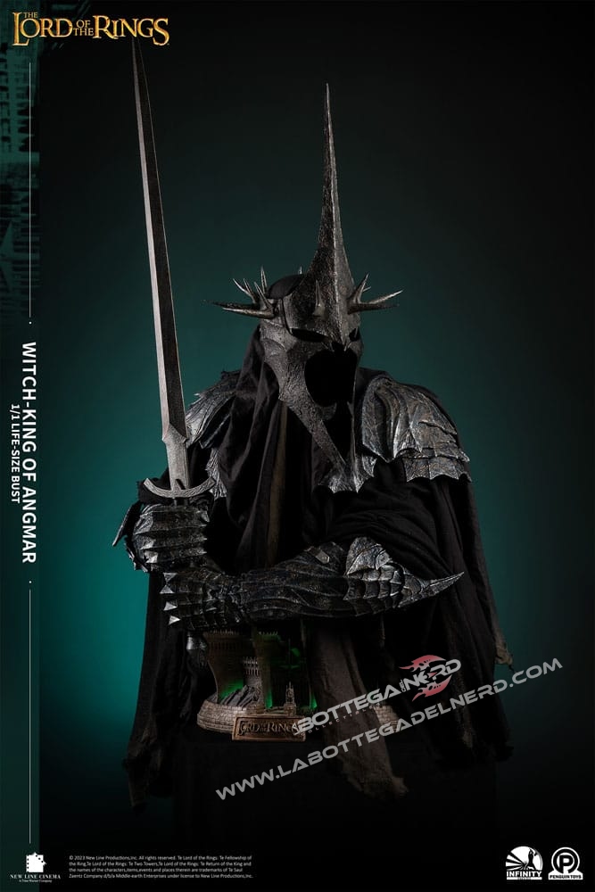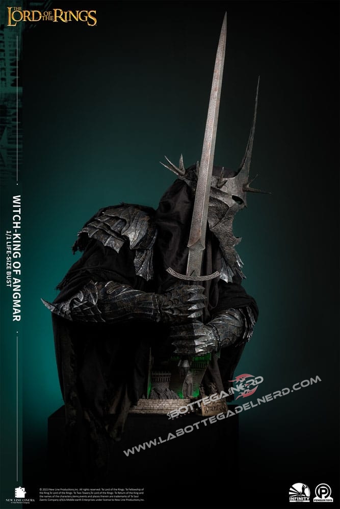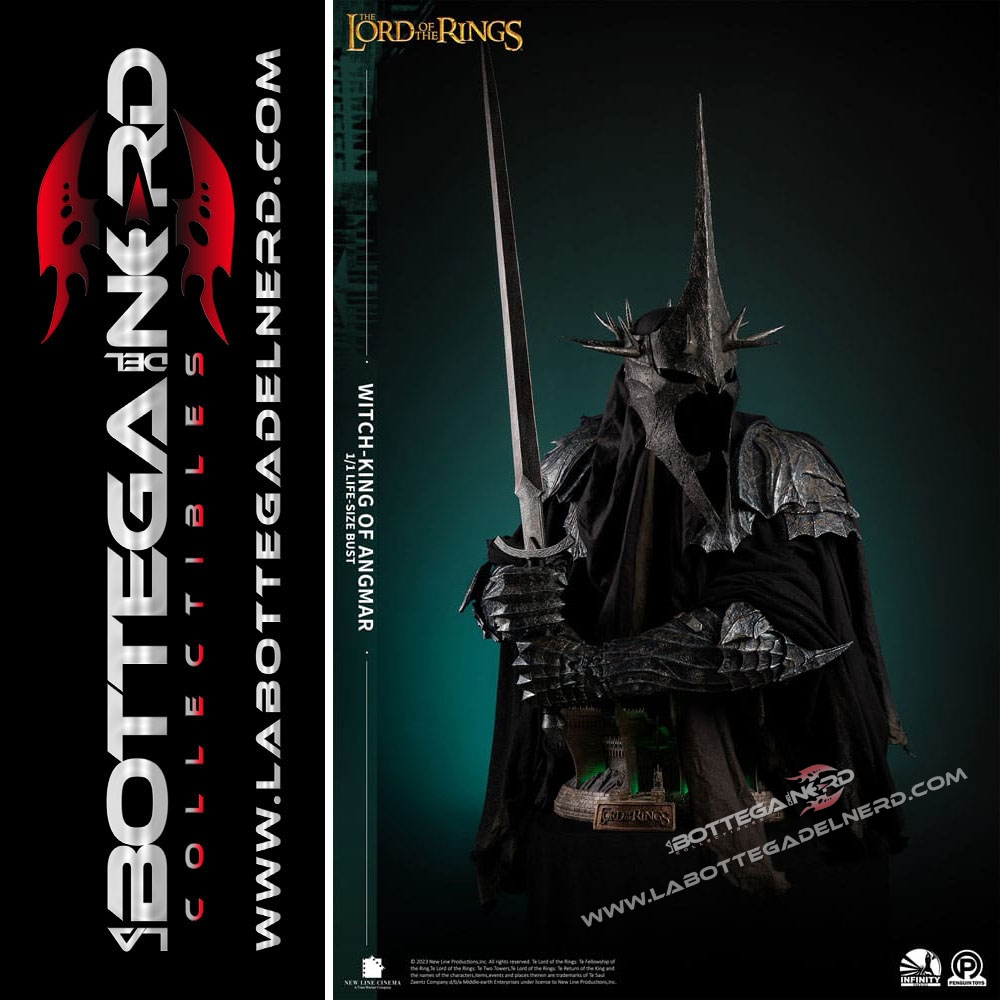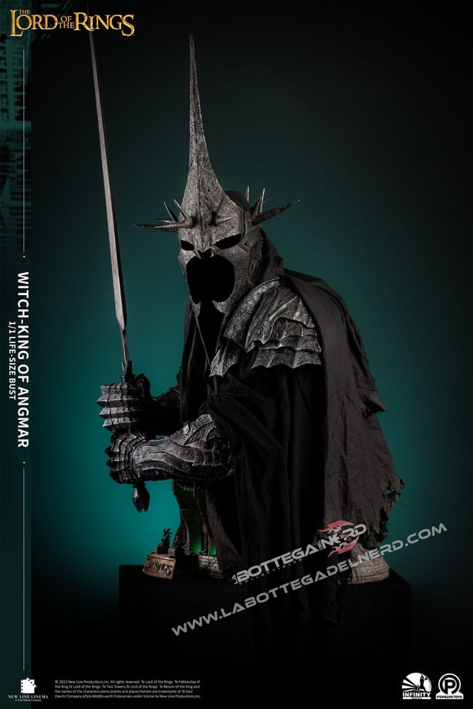 Con 1 Metro e mezzo d’altezza, il busto rappresenterà il RE STREGONE , personaggio chiave nella saga e raffigurato sotto forma di Diorama anche sulla base del busto. La produzione è realizzata in Polystone di altissima qualità con l’ausilio di vero tessuto per realizzare la tunica nera del Witch King, la base si illumina tramite delle apposite luci a LED. SEMPLICEMENTE UN CAPOLAVORO!