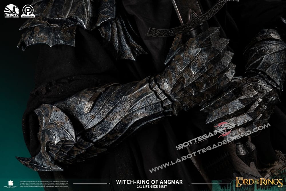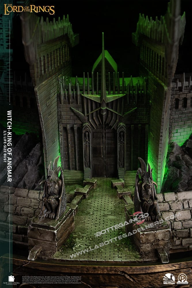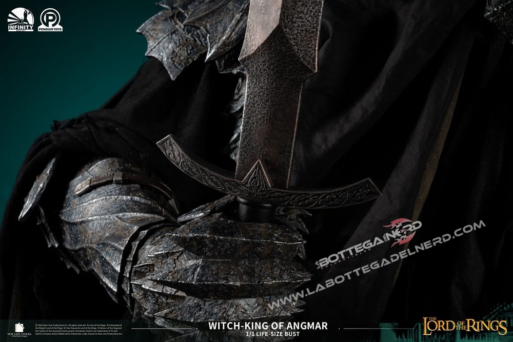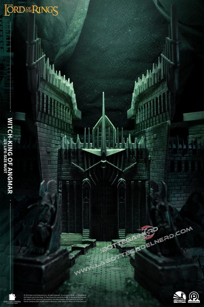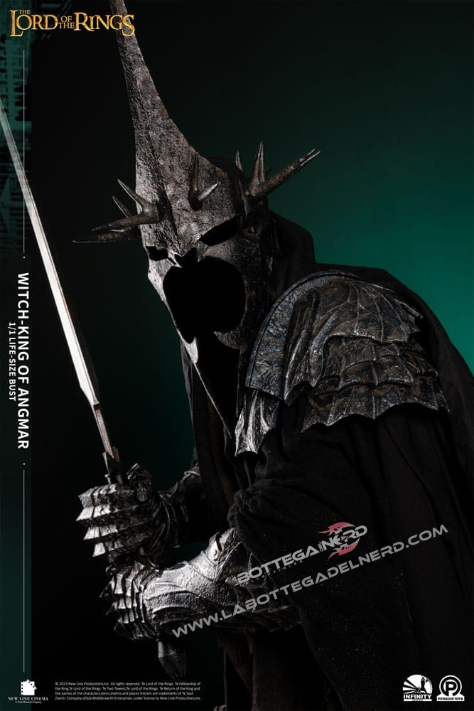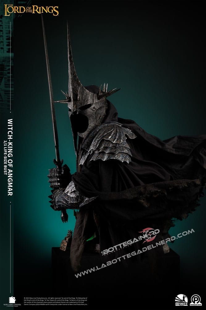 Con 1 Metro e mezzo d’altezza, il busto rappresenterà il RE STREGONE , personaggio chiave nella saga e raffigurato sotto forma di Diorama anche sulla base del busto. La produzione è realizzata in Polystone di altissima qualità con l’ausilio di vero tessuto per realizzare la tunica nera del Witch King, la base si illumina tramite delle apposite luci a LED. SEMPLICEMENTE UN CAPOLAVORO!