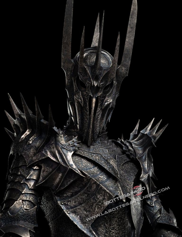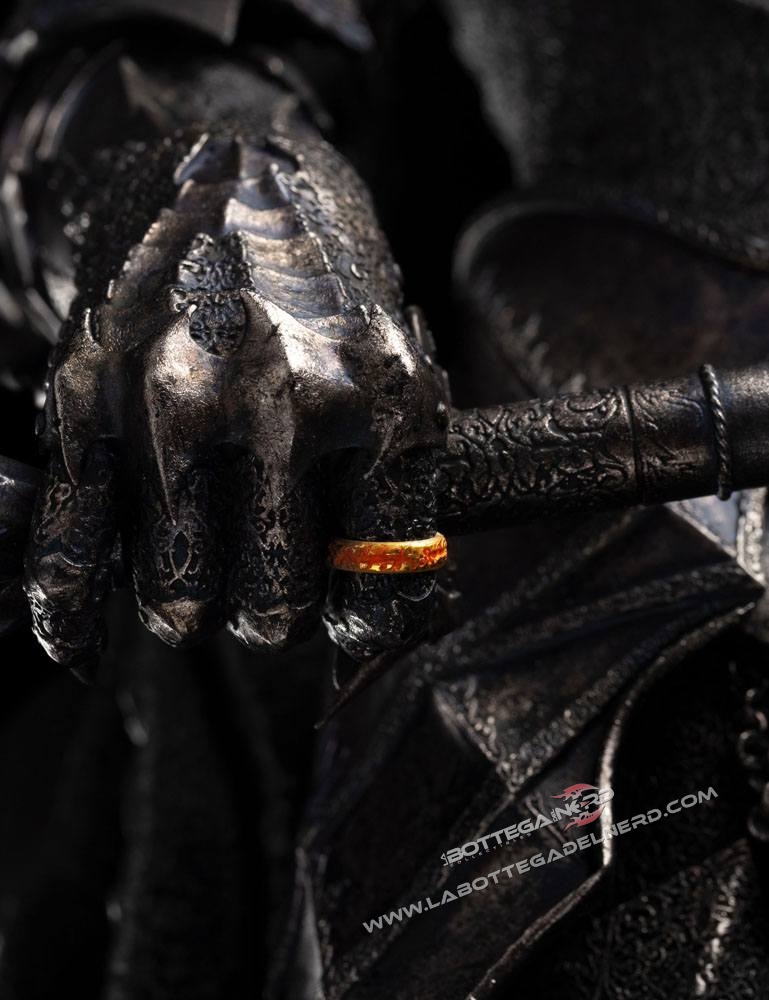La statua è basata sulla versione cinematografica ispirata al romanzo di Tolkien e vede Sauron mostrarsi in tutta la sua possanza, con una mano alzata in gesto di sfida con l’Unico Anello ben visibile sul dito indice.