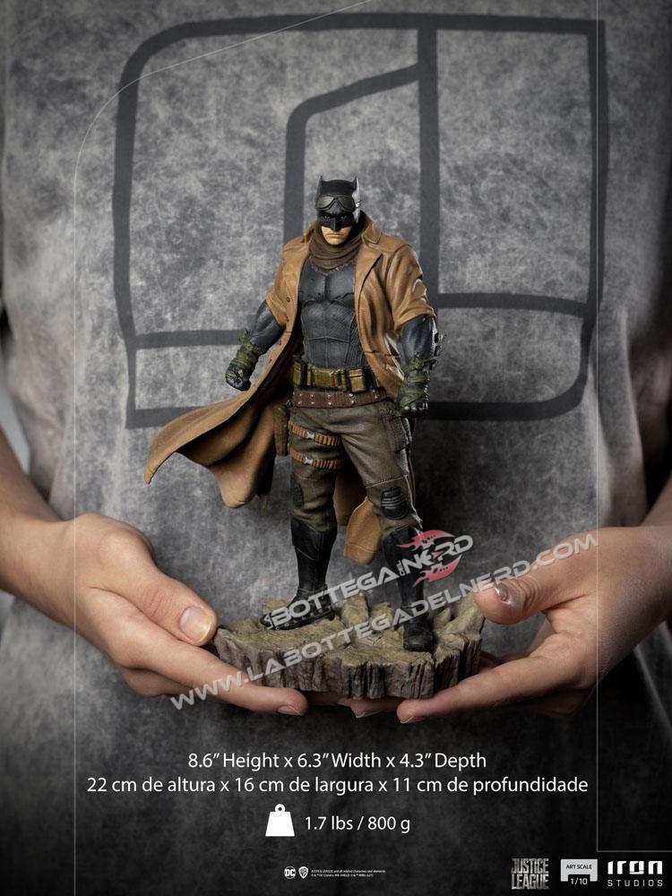 La statua ha un’altezza di 22 cm e rappresenta Batman/Bruce Wayne con le vesti post-apocalittiche che abbiamo visto in questa celebre scena del film. Per il personaggio  stata scelta una posa dinamica, mentre la piccola base diorama richiama le lande desolate del precedentemente menzionato scenario.